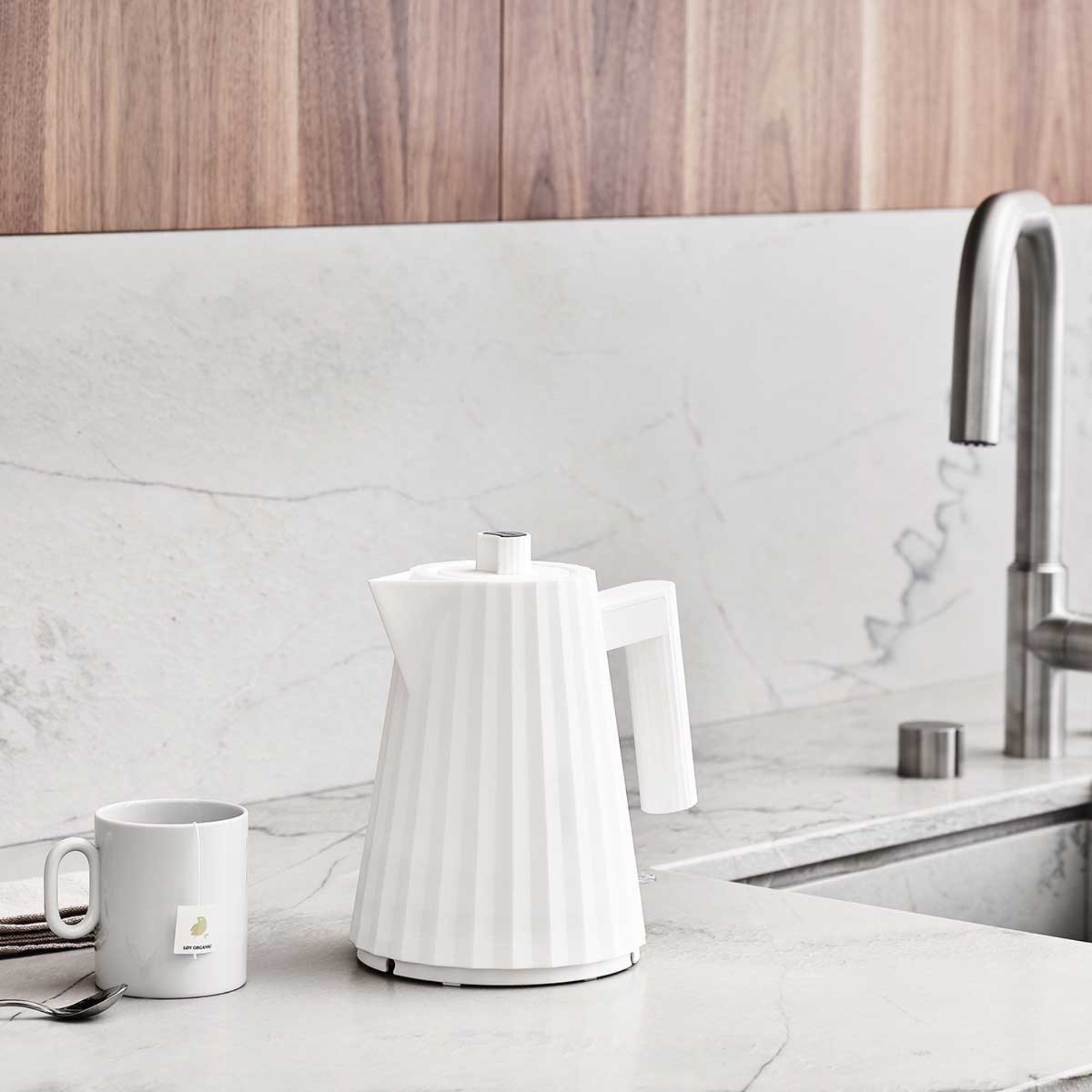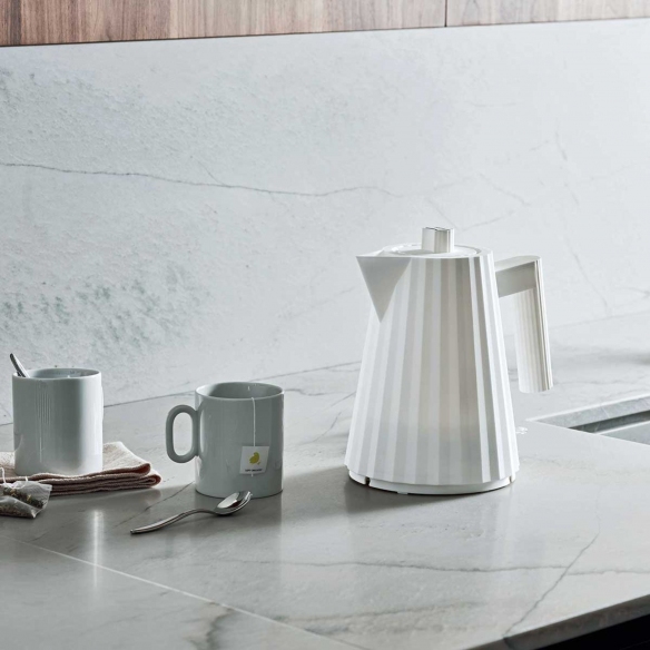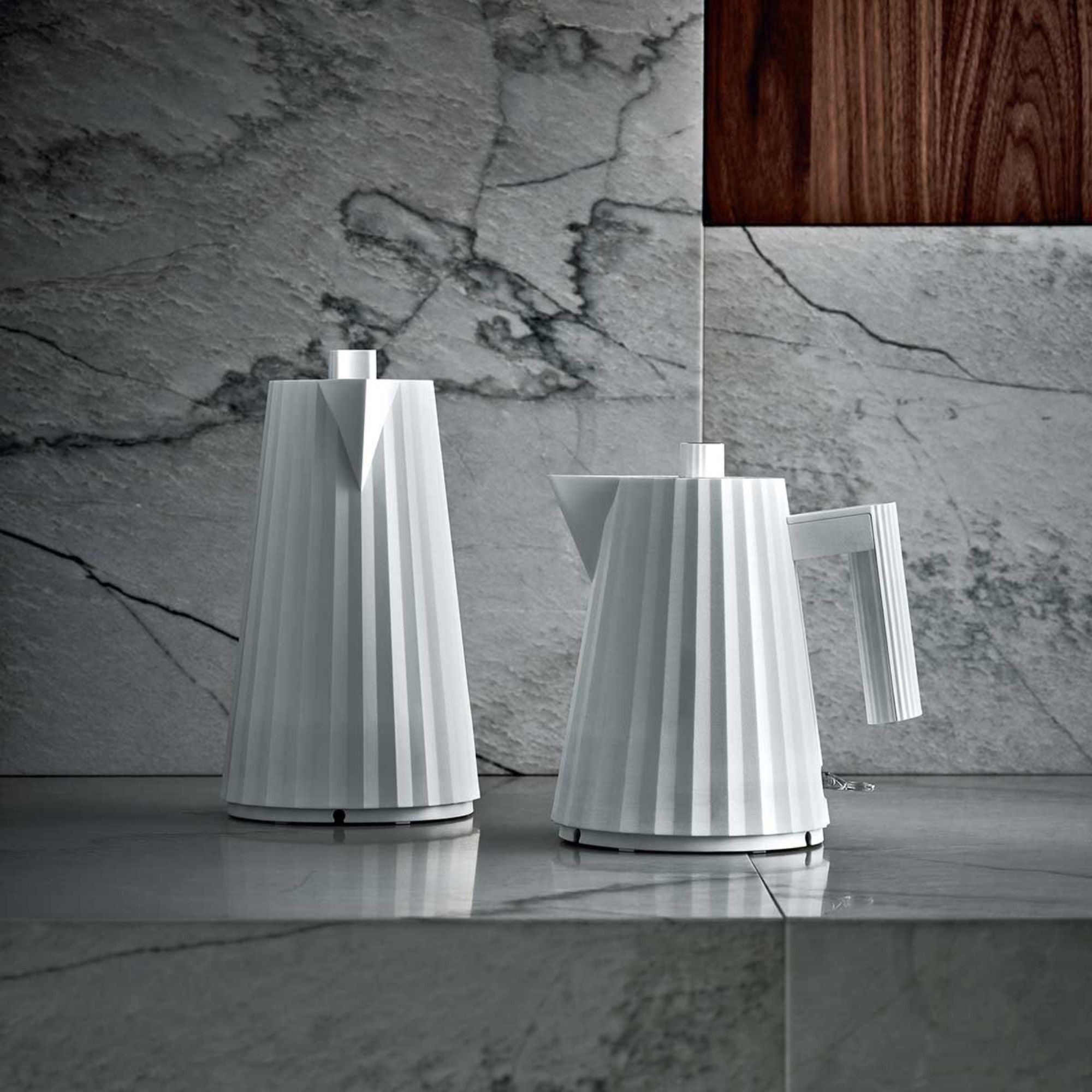 Bollitore elettrico 100 cl Plissé realizzato in resina termoplastica con spina europea e potenza 2400W. Il Bollitore Plissé è composto da una base con resistenza elettrica e un corpo robusto ma molto leggero. Inoltre, è dotato di pulsante accensione in base e filtro anticalcare. Questo bollitore è un oggetto che ricorda i drappeggi di un elegantissimo abito da sera. Il design plastico e affascinante, impreziosisce le cucine di ogni stile e le cinque varianti colore lo rendono adattabile ad ogni tipo di arredamento. Oltre ad essere un oggetto utile e funzionale e anche un pezzo d’arredamento. Disegnato da Michele De Lucchi per Alessi.