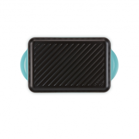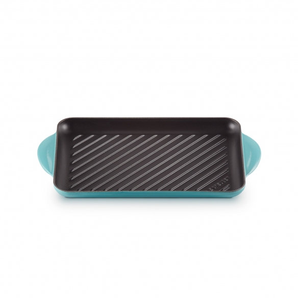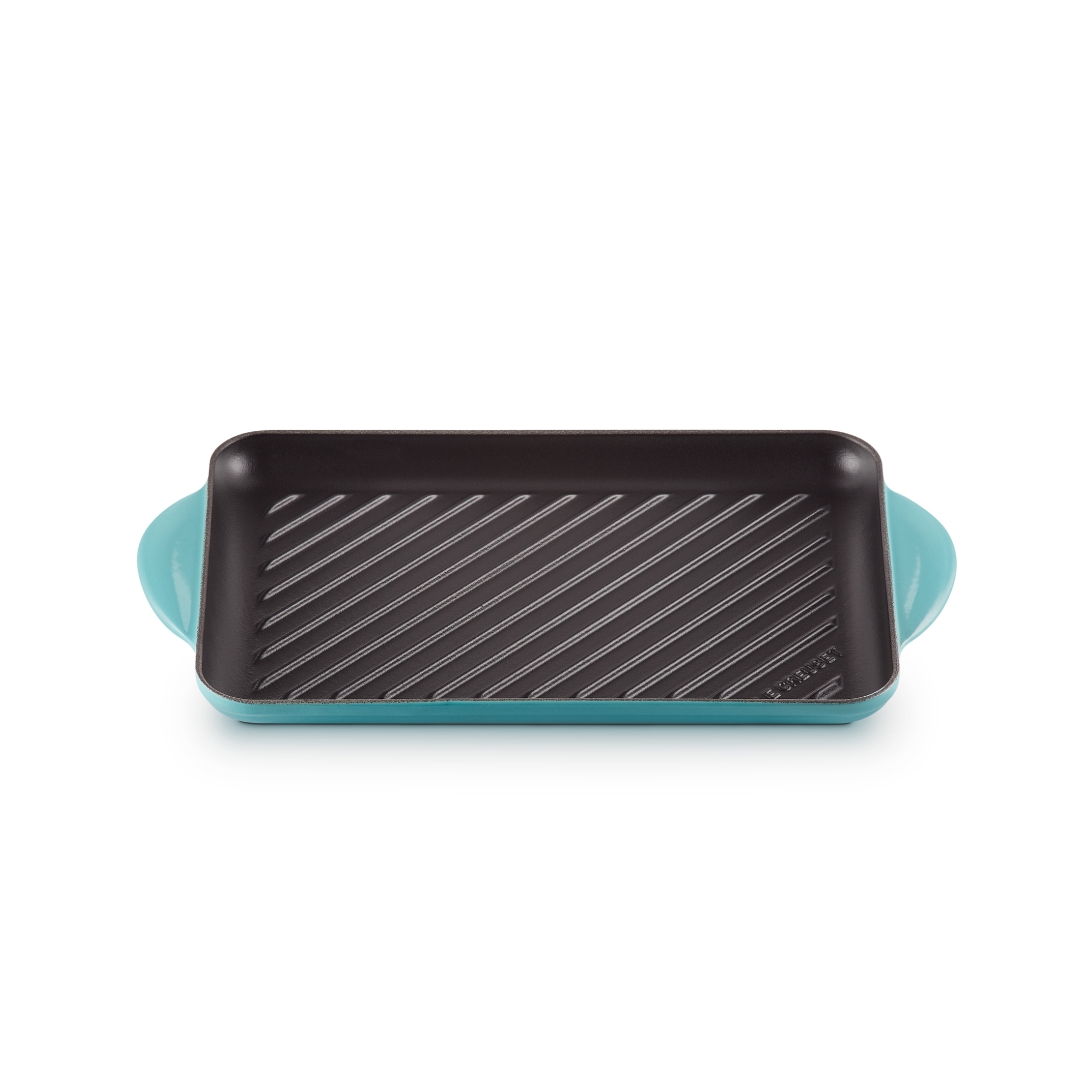 Grill in ghisa fusa smaltata disponibile in 9 finiture di colore: Nero Matt, Ciliegia, Arancio, Blu Marsiglia, Deep Teal, Blu Caribe, Giallo, Mist Grey e Meringue, realizzato da Le Creuset.
