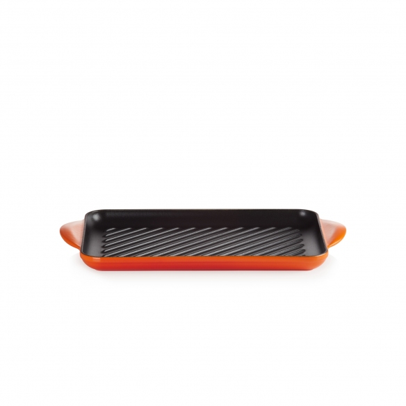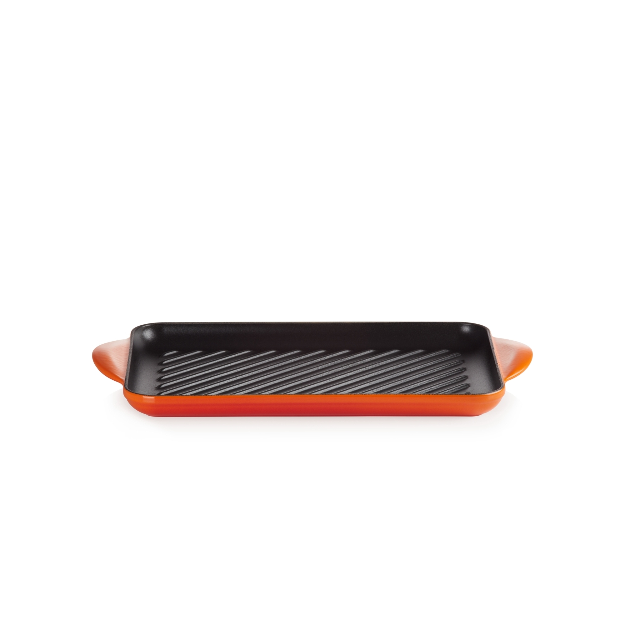 Grill in ghisa fusa smaltata disponibile in 9 finiture di colore: Nero Matt, Ciliegia, Arancio, Blu Marsiglia, Deep Teal, Blu Caribe, Giallo, Mist Grey e Meringue, realizzato da Le Creuset.