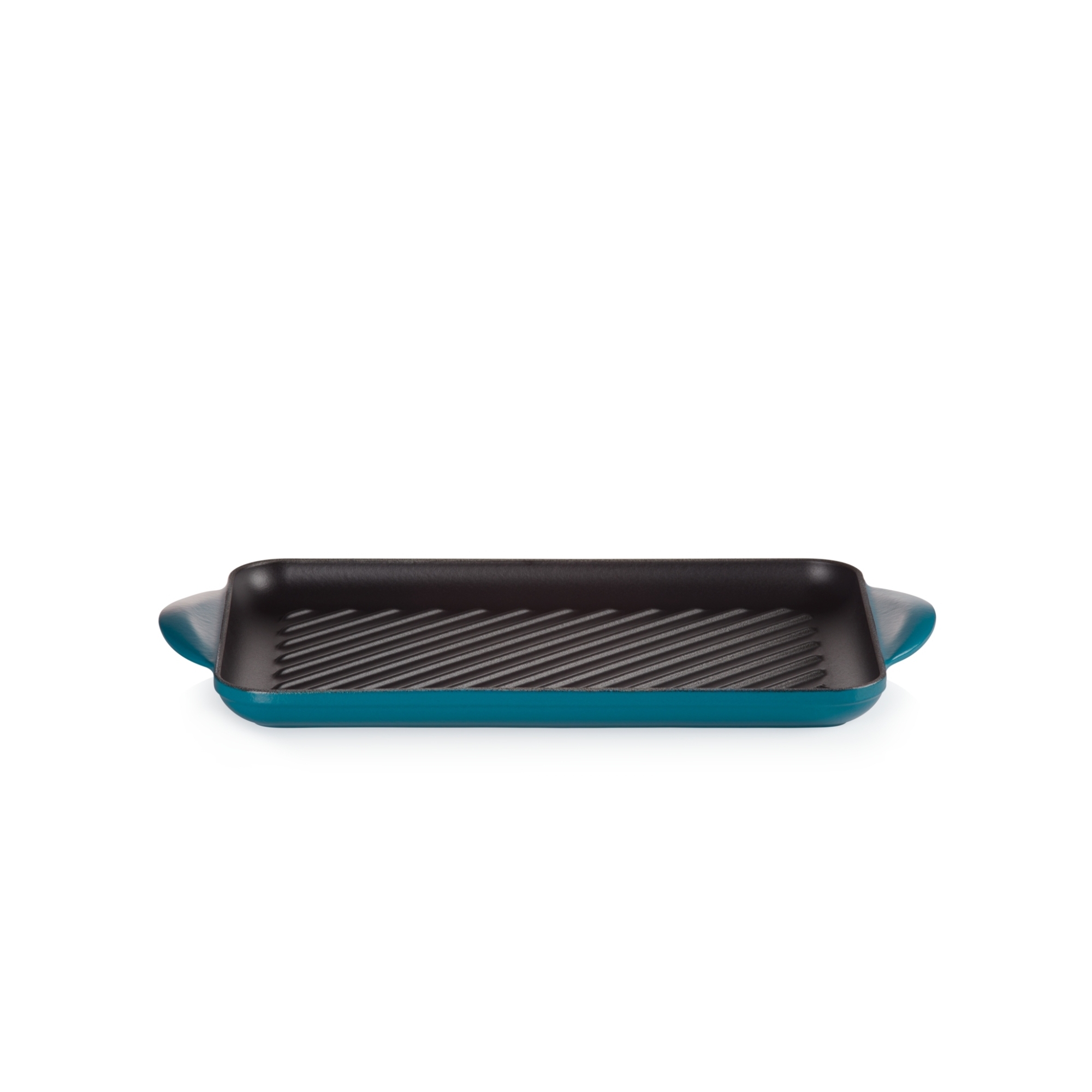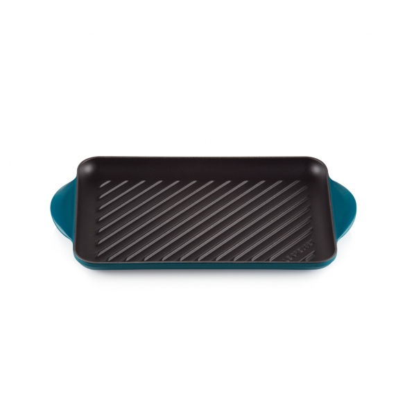 Grill in ghisa fusa smaltata disponibile in 9 finiture di colore: Nero Matt, Ciliegia, Arancio, Blu Marsiglia, Deep Teal, Blu Caribe, Giallo, Mist Grey e Meringue, realizzato da Le Creuset.