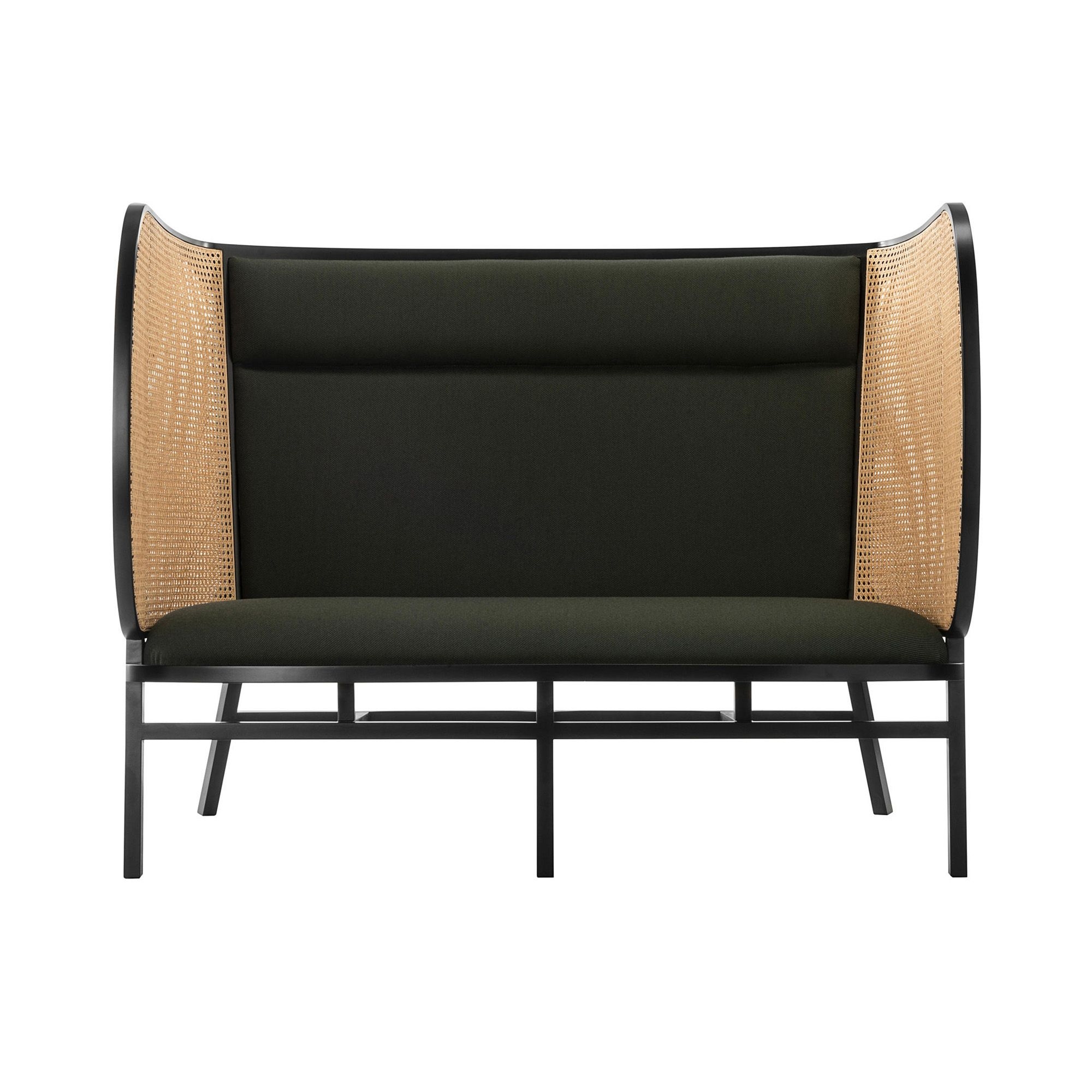 Divano a due posti Hideout con struttura realizzata in legno di faggio curvato a vapore, una comoda seduta e uno schienale alto e accogliente con imbottitura in poliuretano espanso a densità differenziata e ampi braccioli in paglia di Vienna che abbracciano la seduta e creano un senso di maggiore intimità e perfetta per arredare una zona relax o living sia in ambienti privati che pubblici. Il divano è stata così apprezzata da essere inclusa nel progetto di arredamento delle Terme di San Pellegrino e di The Library di San Paolo in Brasile. Progettato da Front per Wiener GTV Design.