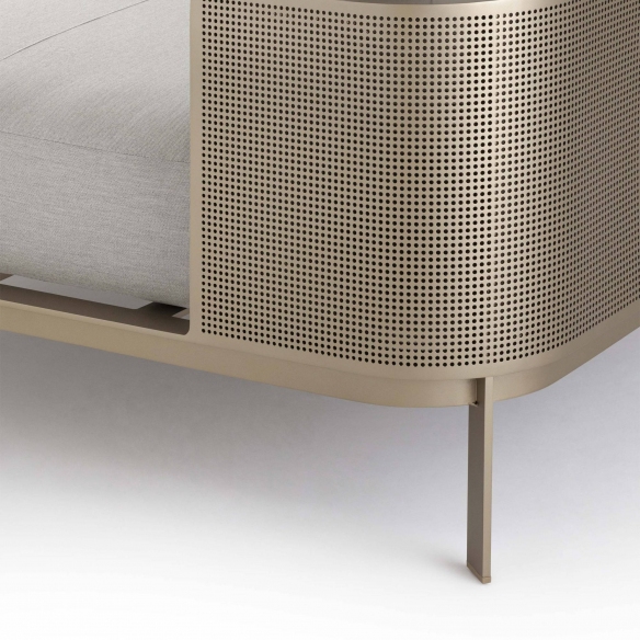 Divano modulare Solanas 2 XL - bracciolo destro con struttura in alluminio verniciato a polveri e lamiera microforata, braccioli in Dekton® by Cosentino, cuscini schienale e seduta con imbottitura in gommapiuma e rivestimento in tessuto idrorepellente e ideale per arredare una area relax all'aperto con stile, qualità e materiali durevoli e resistenti ai raggi UV e alle basse temperature. Il divano si abbina perfettamente ai tavolini da caffè della stessa linea. Progettato da Daniele Germani per Gandía Blasco.