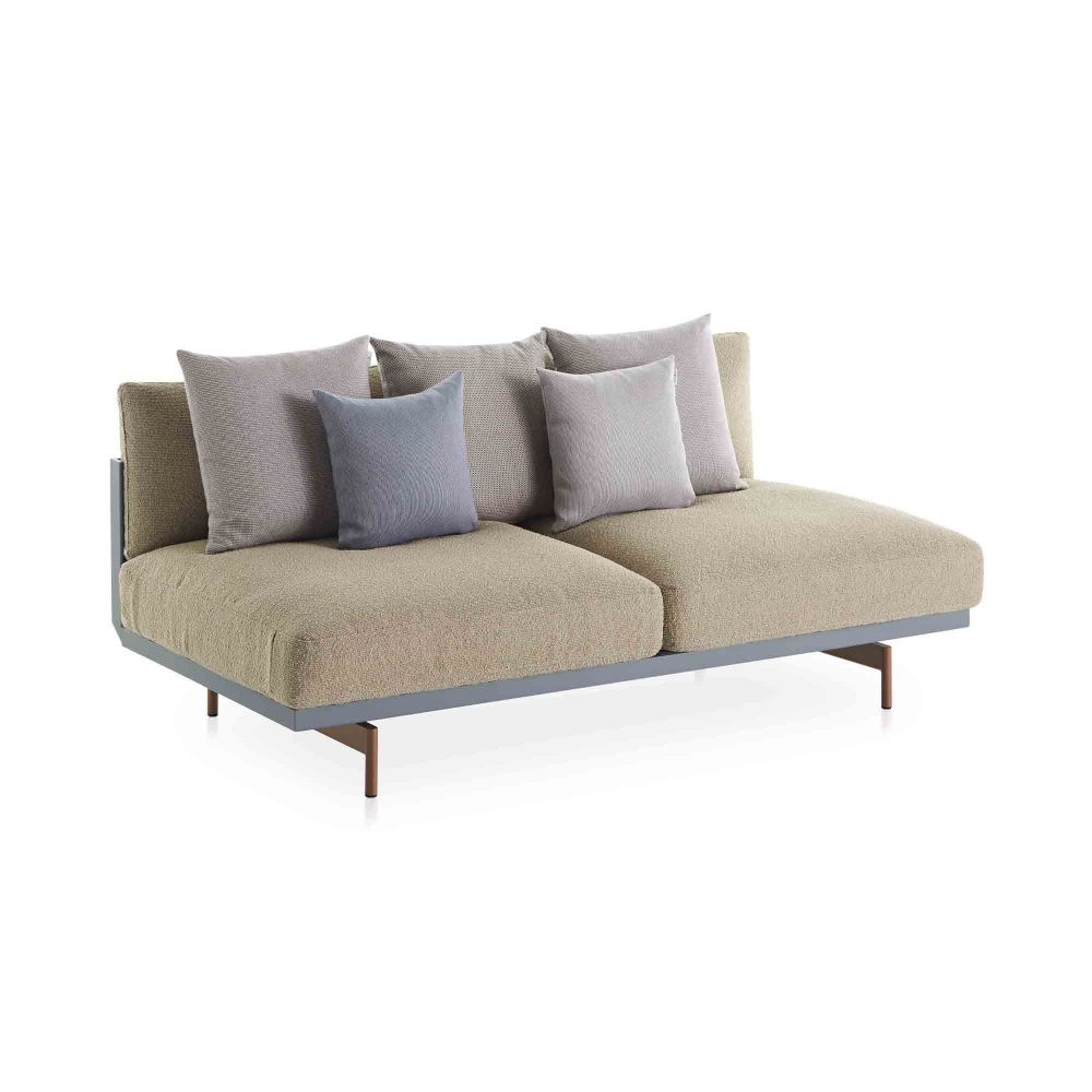 Divano modulare 4 Onde - sezione aperta con struttura in alluminio verniciato a polveri, schienale in lamiera ondulata in alluminio termolaccato, cuscini seduta e schienale imbottiti in gomma poluiretanica espansa e rivestiti in tessuto idrorepellente di prima qualità ( Kvadrat, Sunbrella e Dedar Milano), un design deciso e accattivante, e comodo e accogliente e capace di collocarsi con facilità in moderni spazi esterni di un giardino o di un terrazzo. Disegnato da Luca Nicchetto per Gandía Blasco.