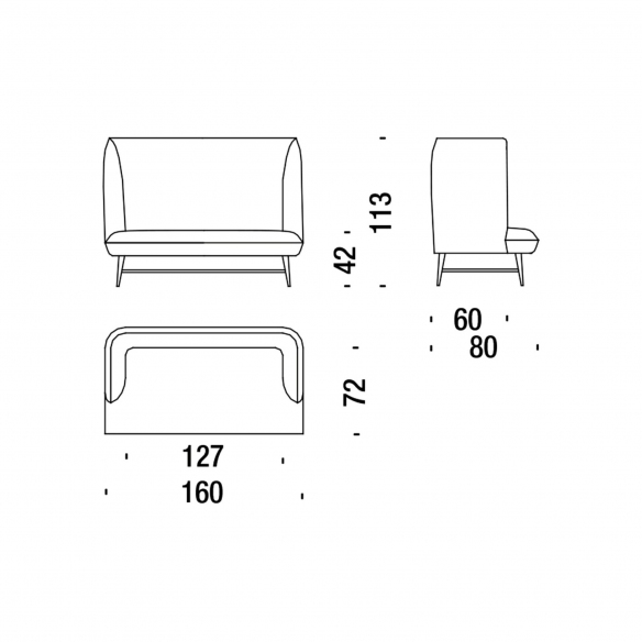 Dimensioni: Larghezza 160 cm, Profondità 80 cm, Altezza seduta 42 cm, Altezza totale 113 cm