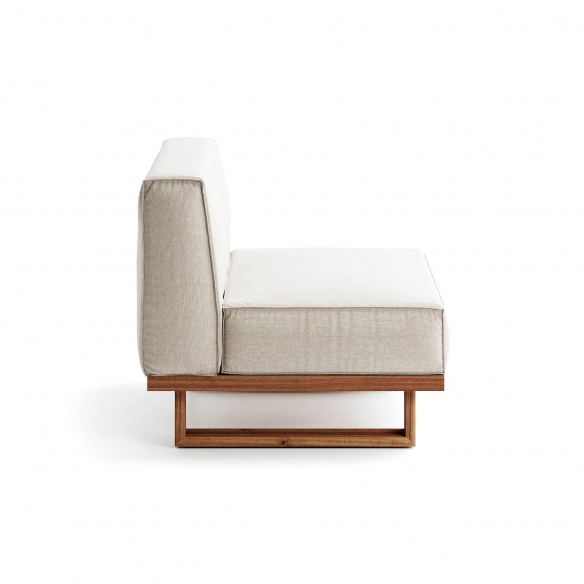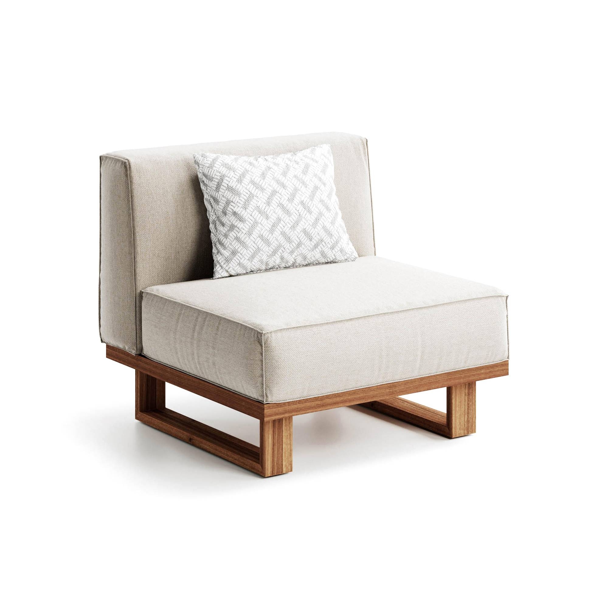 Modulo 1 posto centrale 9.zero realizzato con struttura in teak massiccio asiatico e seduta in gomme drenanti rivestite in tessuto tecnico da esterno. Il design dei moduli base permette la creazione di numerose soluzioni compositive per soddisfare varie esigenze di spazio e funzionalità. La struttura di ogni modulo è realizzata con nove listelli di legno di teak indonesiano, ciascuno largo nove centimetri, levigati e oliati per evidenziare la bellezza naturale e garantire resistenza agli elementi esterni. Le imbottiture, progettate per offrire il massimo comfort, sono fatte con gomme drenanti di alta qualità, e rivestite con tessuti selezionati dalla collezione esterna di Atmosphera, assicurando durabilità e idoneità all'uso esterno. Il modulo 1 posto centrale 9.Zero si integra perfettamente con eleganza e praticità, rendendolo un elemento ideale per arricchire qualsiasi spazio esterno con un tocco di stile personale, senza rinunciare alla comodità e alla robustezza necessarie per apprezzare a pieno la vita all'aperto. Disegnato da Atmosphera Creative Lab.
