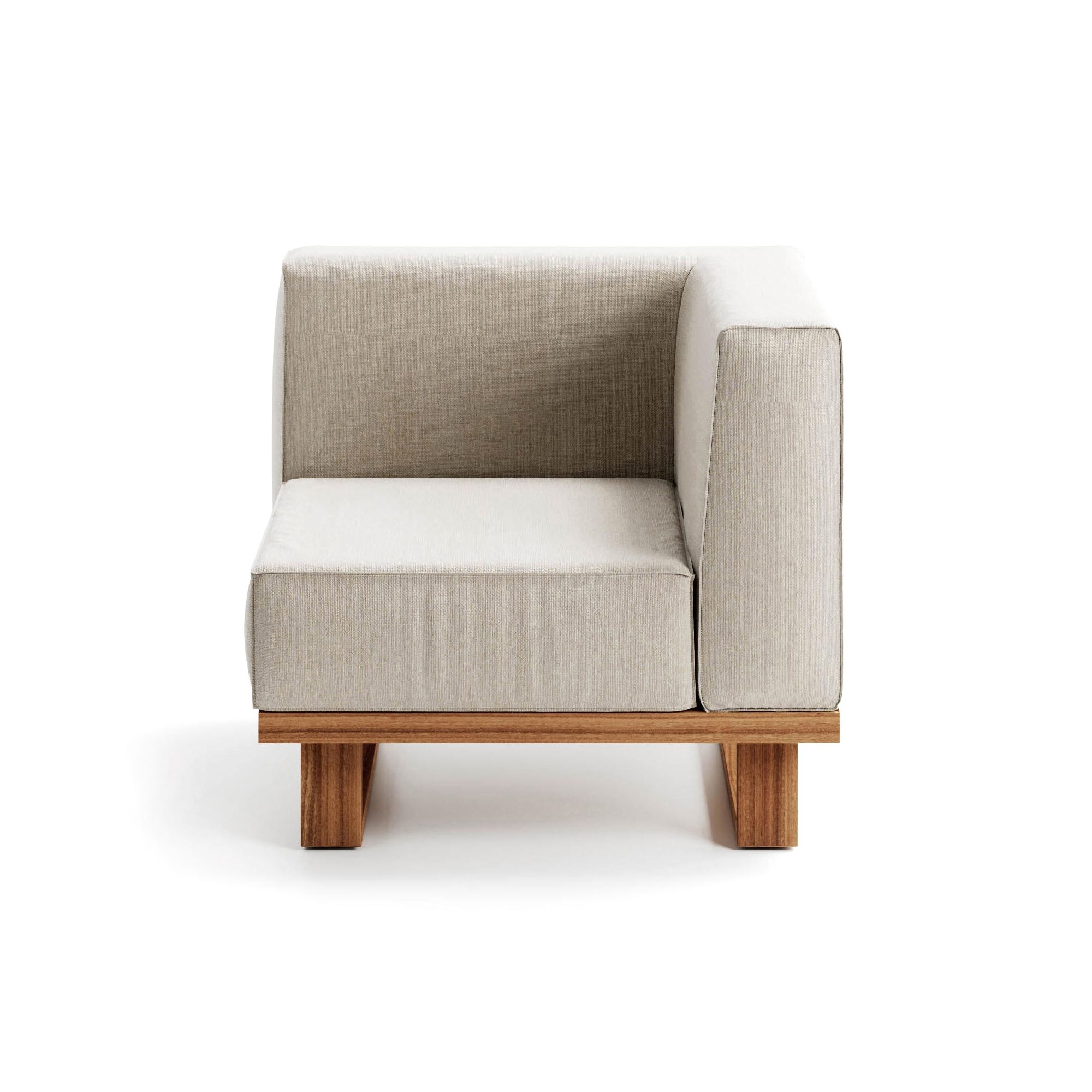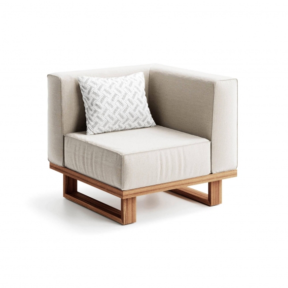 Modulo 1 posto angolare 9.zero (bracciolo a destra) realizzato con struttura in teak massiccio asiatico e seduta in gomme drenanti rivestite in tessuto tecnico da esterno. Il design dei moduli base permette la creazione di numerose soluzioni compositive per soddisfare varie esigenze di spazio e funzionalità. La struttura di ogni modulo è realizzata con nove listelli di legno di teak indonesiano, ciascuno largo nove centimetri, levigati e oliati per evidenziare la bellezza naturale e garantire resistenza agli elementi esterni. Le imbottiture, progettate per offrire il massimo comfort, sono fatte con gomme drenanti di alta qualità, e rivestite con tessuti selezionati dalla collezione esterna di Atmosphera, assicurando durabilità e idoneità all'uso esterno. Il modulo 1 posto angolare 9.Zero si integra perfettamente con eleganza e praticità, rendendolo un elemento ideale per arricchire qualsiasi spazio esterno con un tocco di stile personale, senza rinunciare alla comodità e alla robustezza necessarie per apprezzare a pieno la vita all'aperto. Disegnato da Atmosphera Creative Lab.