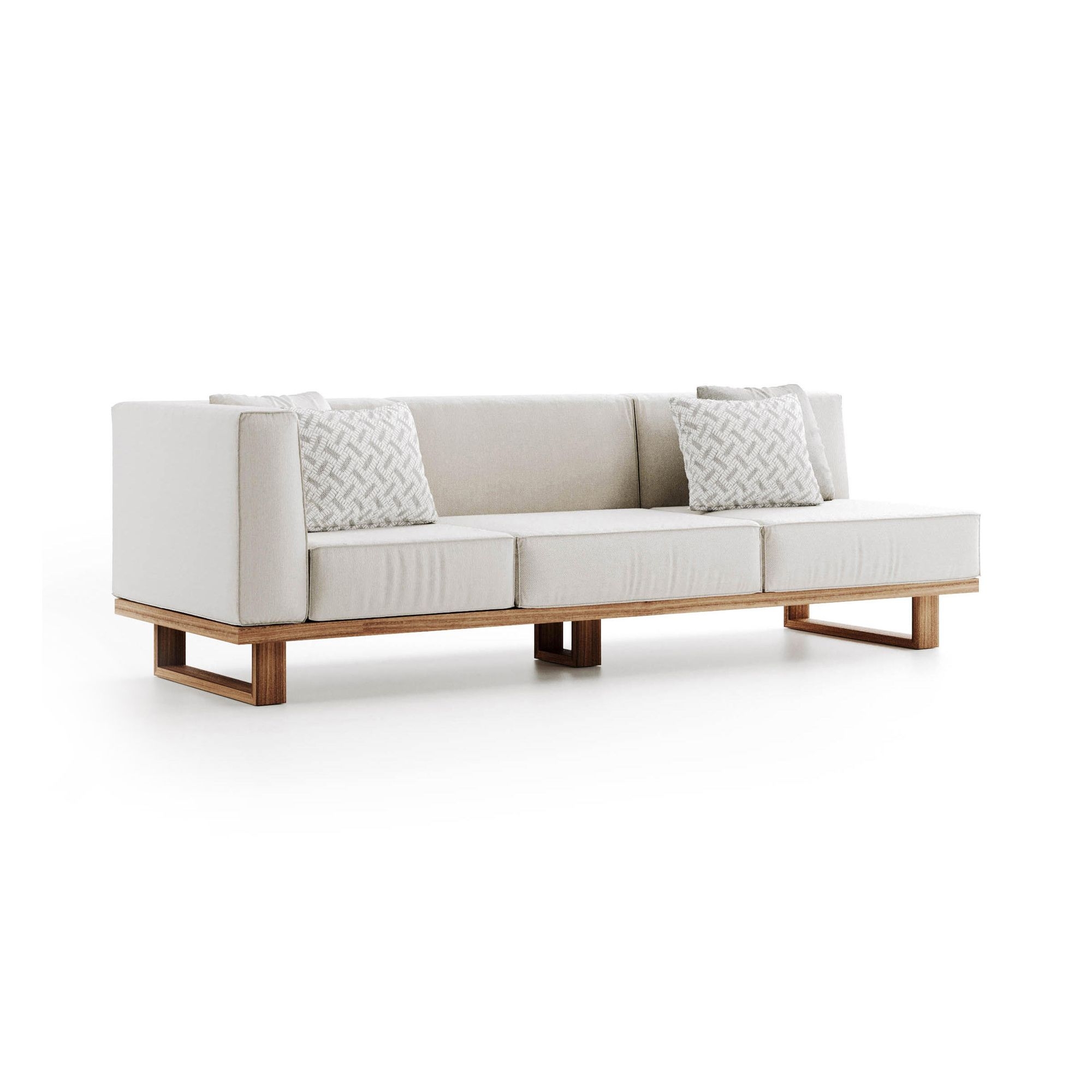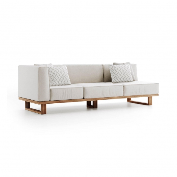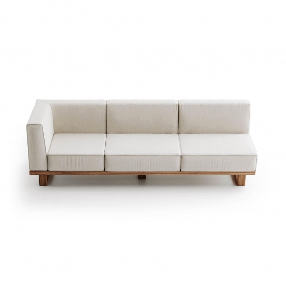 Modulo 3 posti angolare 9.zero realizzato con struttura in teak massiccio asiatico e seduta in gomme drenanti rivestite in tessuto tecnico da esterno. Il design dei moduli base permette la creazione di numerose soluzioni compositive per soddisfare varie esigenze di spazio e funzionalità. La struttura di ogni modulo è realizzata con nove listelli di legno di teak indonesiano, ciascuno largo nove centimetri, levigati e oliati per evidenziare la bellezza naturale e garantire resistenza agli elementi esterni. Le imbottiture, progettate per offrire il massimo comfort, sono fatte con gomme drenanti di alta qualità, e rivestite con tessuti selezionati dalla collezione esterna di Atmosphera, assicurando durabilità e idoneità all'uso esterno. Il modulo 3 posti angolare 9.Zero si integra perfettamente con eleganza e praticità, rendendolo un elemento ideale per arricchire qualsiasi spazio esterno con un tocco di stile personale, senza rinunciare alla comodità e alla robustezza necessarie per apprezzare a pieno la vita all'aperto. Disegnato da Atmosphera Creative Lab.