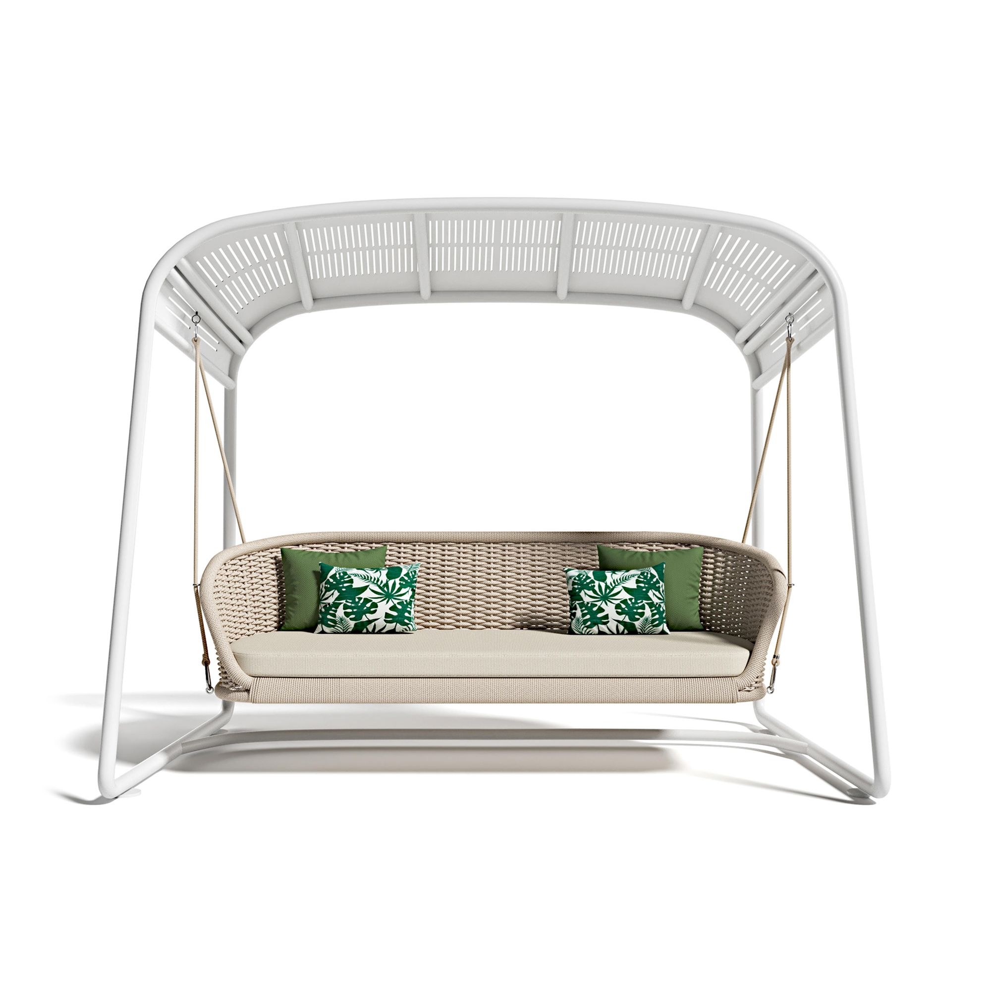 Divano dondolo con piedistallo Ludo .L5 realizzato con struttura del piedistallo in ferro zincato, struttura del divano in corda intrecciata a mano e cuscino della seduta rivestito in tessuto outdoor. Disponibile in varie colorazioni, il divano dondolo Ludo .L5 è la quintessenza dell'eleganza e del comfort. La lavorazione artigianale dà vita a forme sinuose che cullano in un abbraccio di puro relax, rendendo ogni istante di riposo un'esperienza unica. L'estetica calda del divano dondolo Ludo, frutto dell'abbinamento armonioso tra materiali naturali e design raffinato, lo rende incredibilmente versatile e facilmente abbinabile a diversi stili di interni. Che sia collocato in un living contemporaneo o in un portico in stile rustico, Ludo si integra alla perfezione, portando con sé un tocco di eleganza discreta. La collezione Ludo è stata pensata per offrire il massimo del comfort e della funzionalità. Ogni dettaglio è stato curato con estrema attenzione, dalla scelta dei materiali alla progettazione di elementi ergonomici che assicurano una comodità senza pari. La superficie del divano, avvolta in corde morbide e piacevoli al tatto, invita all'abbandono in un relax profondo e rigenerante, promettendo momenti di puro benessere. Completano l'esclusiva collezione Ludo anche poltrone, tavolini, lanterne e dondoli, tutti progettati con la stessa cura e attenzione per il dettaglio che caratterizzano il divano con piedistallo. Ogni pezzo contribuisce a creare un'atmosfera accogliente e distensiva, ideale per godersi il proprio spazio esterno o interno in piena tranquillità. Scegliere il divano dondolo con piedistallo Ludo .L5 significa immergersi in un'esperienza di comfort e stile senza precedenti, all'insegna di una qualità che solo l'artigianalità e l'attenzione al dettaglio possono garantire. Lasciati sedurre dal fascino di Ludo e trasforma il tuo spazio in un'oasi di relax e bellezza senza tempo. Disegnato da Atmosphera Creative Lab.