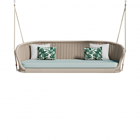 Divano dondolo da esterno Ludo .L4 realizzato con struttura in corda, schienale in corda intrecciata a mano e cuscino della seduta rivestito in tessuto outdoor. Disponibile in vari colori e tessuti, il divano dondolo outdoor Ludo .L4 rappresenta l'unione perfetta tra design di avanguardia e confort assoluto. Con una struttura portante in corda e un'ampia seduta supportata da un cuscino realizzato in tessuto per esterni, questo divano dondolo è pensato per resistere agli elementi e offrire il massimo del comfort anche all'aperto. Disponibile in un'ampia gamma di colori e tessuti, il Ludo .L4 consente una personalizzazione estetica che si adatta a qualsiasi ambiente esterno, che sia un giardino moderno, un terrazzo spacioso o un patio accogliente. Con il suo schienale in corda intrecciata a mano, il divano dondolo Ludo .L4 non è solo un punto di riferimento per il riposo e il relax ma anche un vero capolavoro di artigianato. L'accostamento di forme nette e profili lisci rende questo divano dondolo un pezzo di arredo esterno che non passa inosservato, capace di offrire un tocco di eleganza contemporanea a ogni spazio all'aperto. La solidità dei materiali, tra cui il noto legno di Teak, ne garantisce la durata nel tempo e la resistenza, senza rinunciare a un'estetica incantevole che attira lo sguardo e invita all'utilizzo. Integrando ergonomia e design, il divano dondolo Ludo .L4 è il luogo ideale dove trascorrere ore di relax, avvolti dalla natura, in totale comodità e stile. Questo irresistibile divano dondolo è stato progettato per portare un angolo di paradiso nel vostro ambiente esterno, completato efficacemente dal sistema di fissaggio incluso che ne facilita l'installazione e garantisce sicurezza e stabilità in ogni momento.