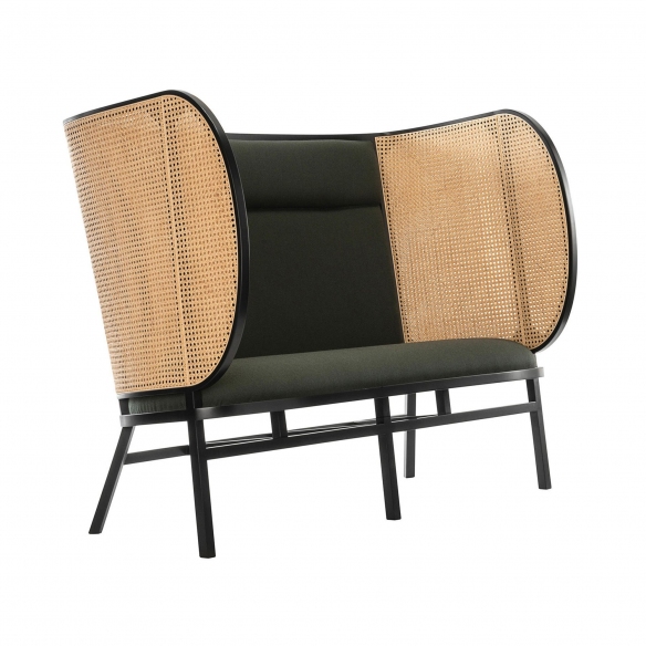 Divano a due posti Hideout con struttura realizzata in legno di faggio curvato a vapore, una comoda seduta e uno schienale alto e accogliente con imbottitura in poliuretano espanso a densità differenziata e ampi braccioli in paglia di Vienna che abbracciano la seduta e creano un senso di maggiore intimità e perfetta per arredare una zona relax o living sia in ambienti privati che pubblici. Il divano è stata così apprezzata da essere inclusa nel progetto di arredamento delle Terme di San Pellegrino e di The Library di San Paolo in Brasile. Progettato da Front per Wiener GTV Design.