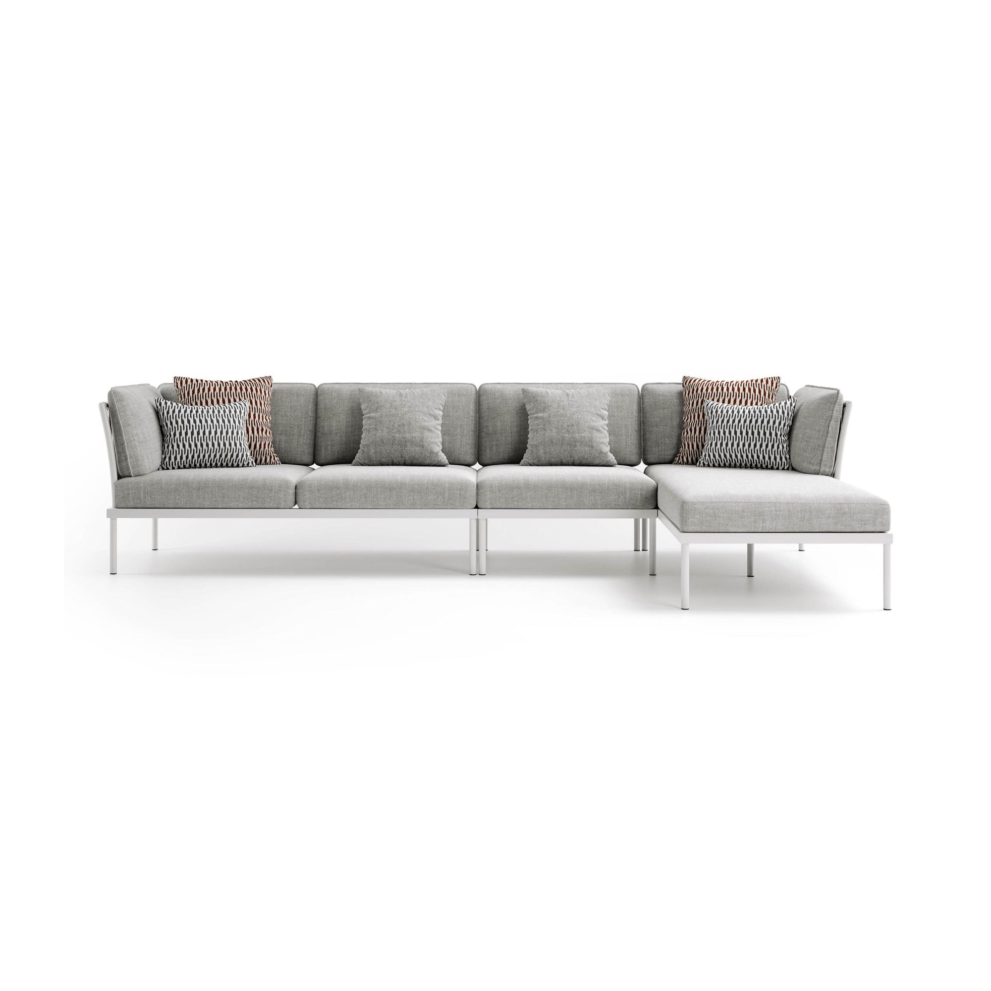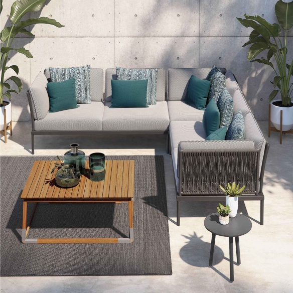 Divano modulare da esterno Flash realizzato con struttura in alluminio verniciato epossidico per esterni, pannelli laterali in corda intrecciata a mano e cuscini della seduta e dello schienale rivestiti in tessuto outdoor. Disponibile in varie combinazioni di colori e tessuti, il divano modulare outdoor Flash rappresenta la quintessenza del design modulare, coniugando funzionalità ed eleganza in un'unica soluzione d'arredo per esterni capace di adattarsi a qualsiasi spazio e esigenza. Progettato per offrire il massimo della comodità e dello stile, questo divano modulare si distingue per la sua struttura in alluminio verniciato epossidico, ideale per resistere alle sfide del clima esterno mantenendo inalterato il proprio splendore nel tempo. Grazie alla sua modularità, è possibile creare configurazioni personalizzate che rispecchiano le necessità di spazio e stile di ogni ambiente esterno, dal giardino domestico alle ampie terrazze di locali e strutture ricettive, garantendo sempre il massimo dell'accoglienza e del comfort. I cuscini, realizzati con tessuti ad alta resistenza specifici per l'outdoor, offrono un comfort superiore e sono disponibili in una varietà di colori e finiture per soddisfare ogni esigenza estetica e garantire una perfetta integrazione con il contesto circostante. L'attenzione ai dettagli, come l'utilizzo di materiali durevoli e il design raffinato, rendono il divano modulare Flash un elemento d'arredo distintivo che valorizza qualsiasi spazio all'aperto, aggiungendo un tocco di stile contemporaneo e creando un ambiente ideale per momenti di puro relax e convivialità all'aria aperta. Disegnato da Atmosphera Creative Lab.