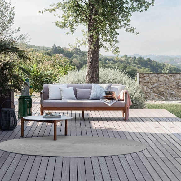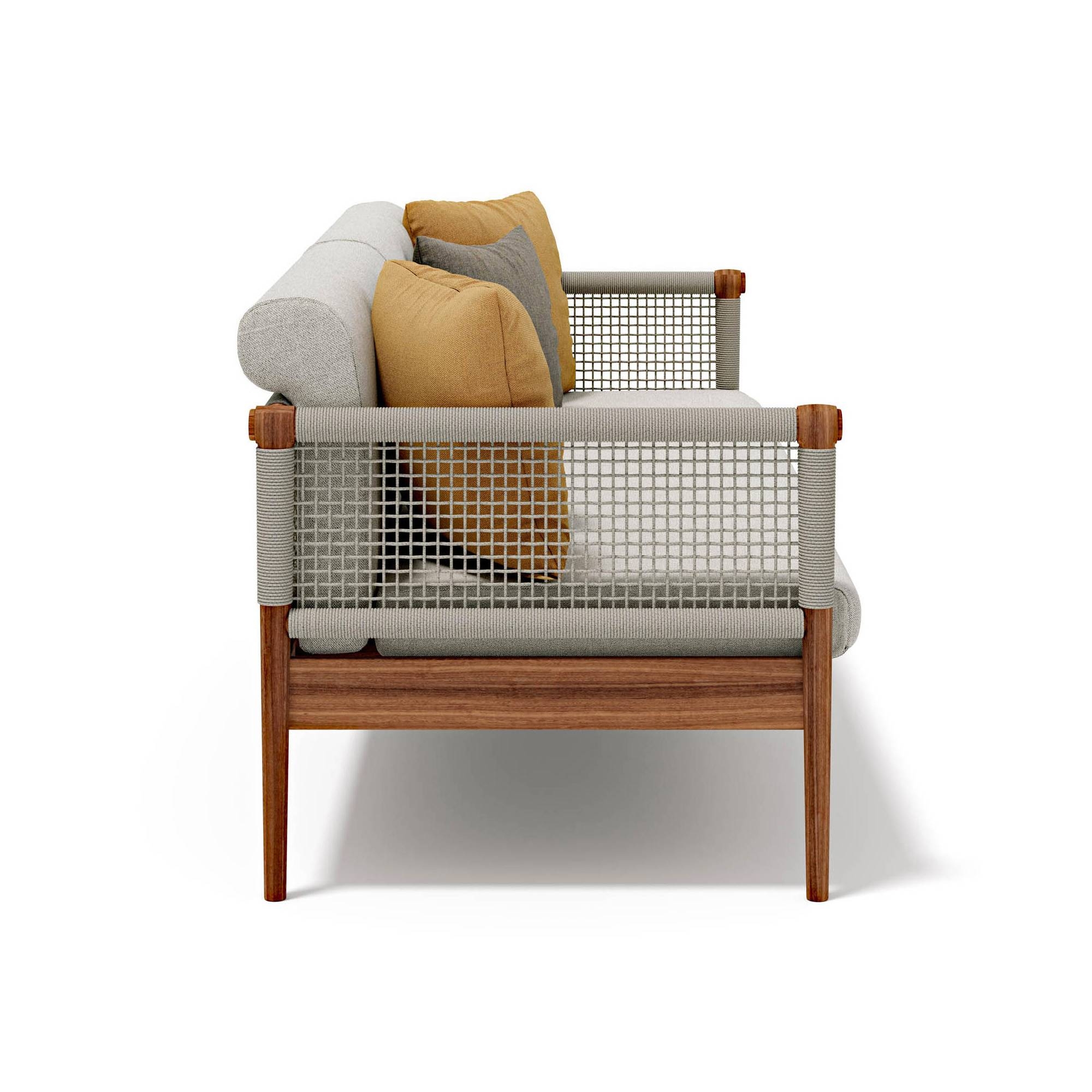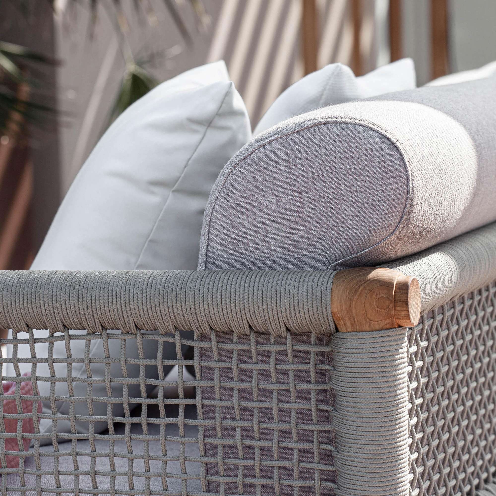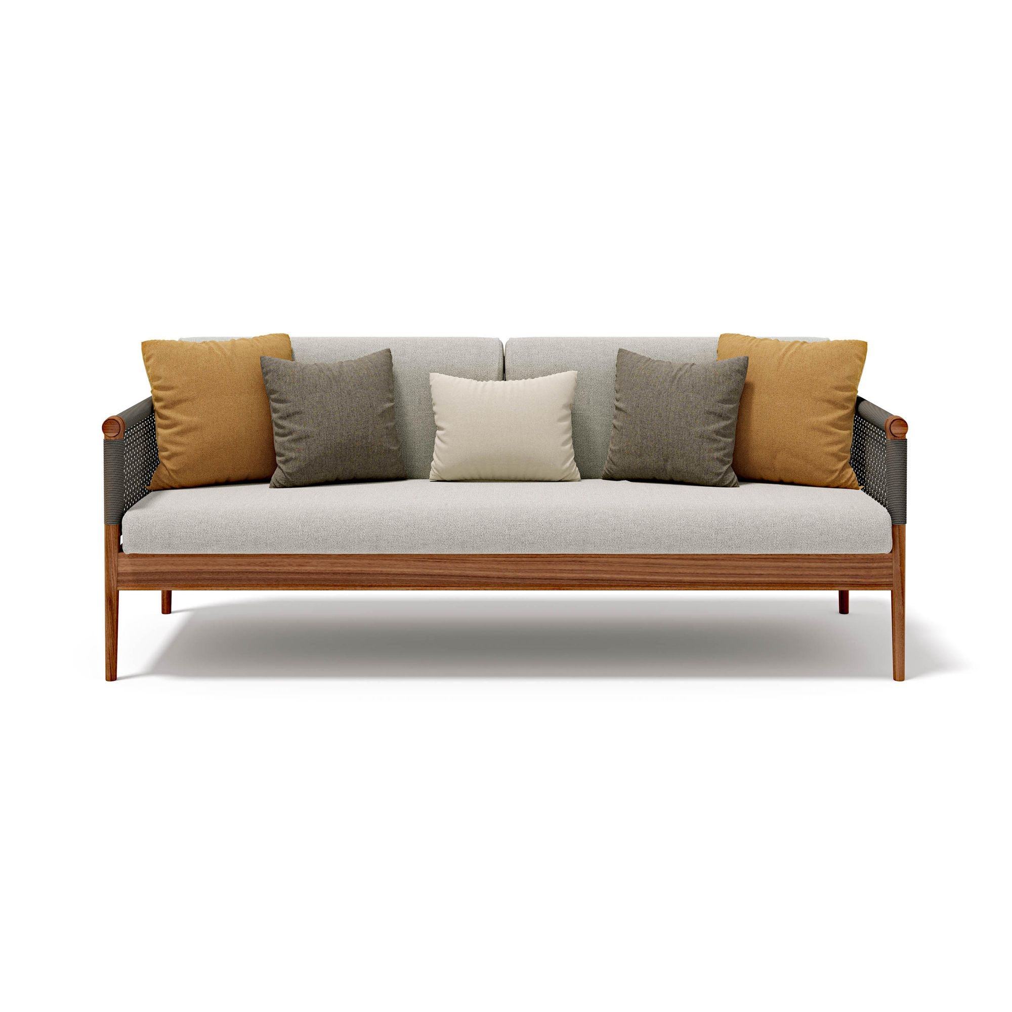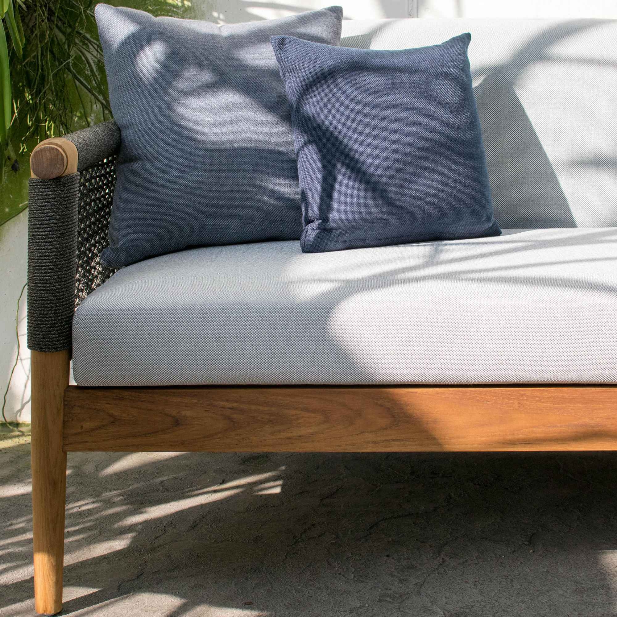 Divano da esterno Lodge realizzato con struttura in teak intrecciata da una corda rotonda che crea una maglia morbida e di forte tenuta, cuscini della seduta e dello schienale rivestiti in tessuto outdoor. Questo divano è perfetto per aggiungere un tocco di eleganza e raffinatezza al vostro spazio esterno, garantendo al tempo stesso resistenza e durabilità grazie ai materiali di alta qualità utilizzati. I cuscini, rivestiti in un tessuto pregiato adatto all'esterno, garantiscono una seduta morbidissima, ideale per i vostri momenti di relax all'aria aperta. Che sia posizionato in un giardino, su un patio o in una terrazza, il divano da esterno Lodge trasforma qualsiasi ambiente in un'oasi di comfort e stile, perfetto per ospitare amici o per godere di momenti di pace in solitudine. La sua estetica minimalista, ma al contempo sofisticata, lo rende il complemento d'arredo esterno ideale per chi cerca un design elegante senza rinunciare alla comodità. Il divano da esterno Lodge, progettato con una visione orientata alla funzionalità e all’eleganza, diventerà senza dubbio il protagonista del vostro spazio all’aperto, invitando al relax e all'ospitalità con uno stile impeccabile. Disegnato da Atmosphera Creative Lab.