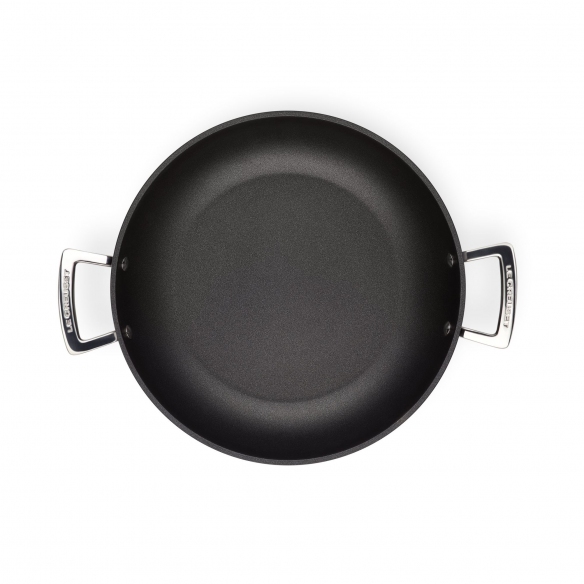 Tegame basso in alluminio antiaderente dal diametro di 30 cm con coperchio in vetro. Caratterizzato dal migliore rivestimento antiaderente Le Creuset, questo fantastico tegame basso è resistente anche all'uso di utensili in metallo, davvero indistruttibile! Ideale per una cucina salutare, questo tegame permette al cibo di staccarsi facilmente in modo che non sia necessario aggiungere grassi, pietanze davvero impeccabili! La struttura anodizzata offre una conduzione e una distribuzione del calore efficienti per una cottura uniforme e completa, così i tuoi cibi rimarranno caldi a lungo anche a tavola! Il coperchio in vetro oltre che conservare la succulenza e il sapore delle tue pietanze, ti permette di controllarne la cottura in ogni fase! Un tegame davvero unico! Garantito a vita!