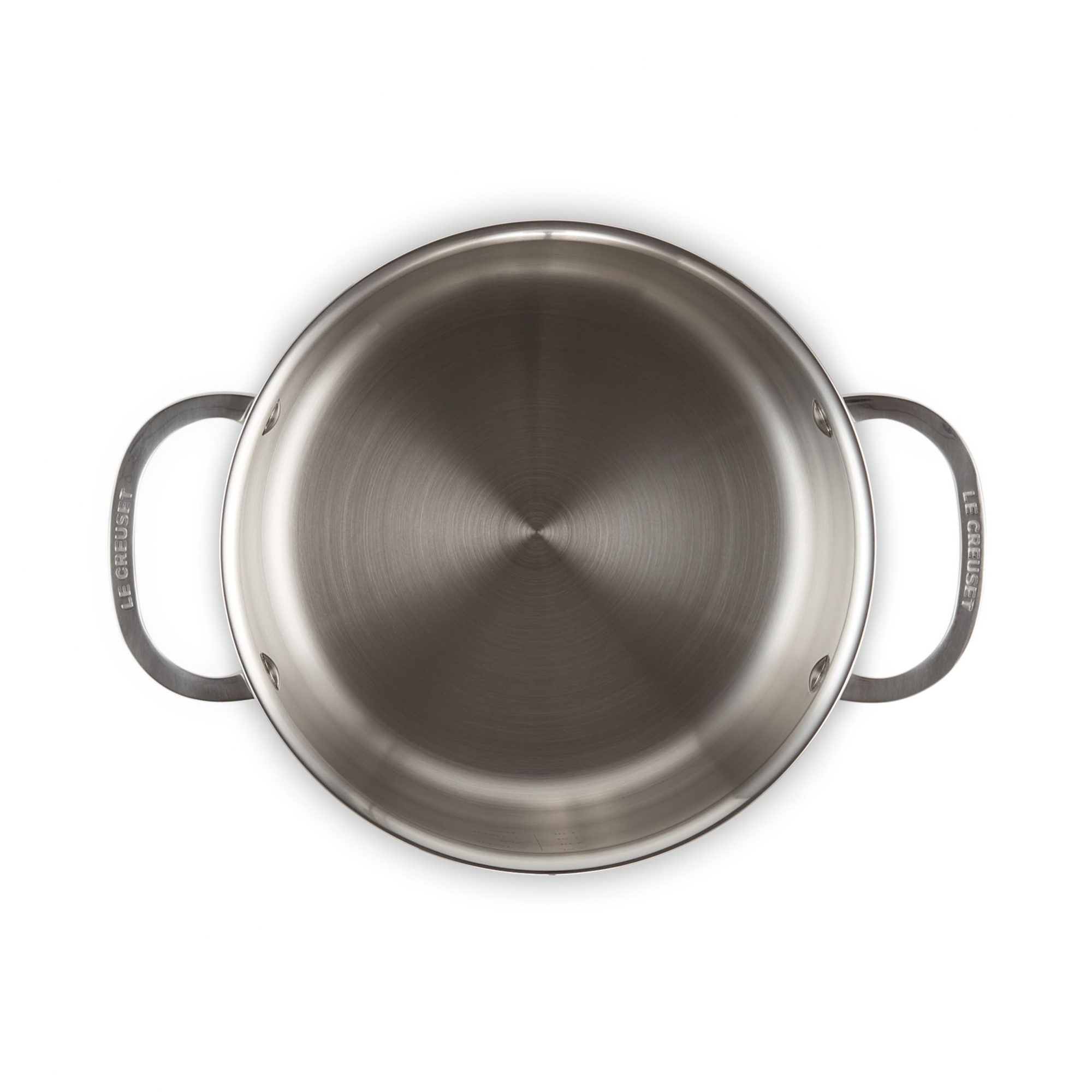 Casseruola in acciaio inossidabile compresa di coperchio dal diametro di 20 cm. Caratterizzata dal classico motivo a tre anelli firmato Le Creuset, questa casseruola è l'ideale per tutte le tue preparazioni in cucina: dalla cottura di pasta alle patate dal riso agli stufati e molto altro! La sua resistenza ti sorprenderà: la tecnologia a 3 strati composta da acciaio inossidabile e alluminio di massima qualità distribuisce il calore uniformemente e gradualmente all'intera superficie. Il materiale è caratterizzato da una resistenza inaudita nel tempo ed è progettato per la cucina di tutti giorni, in altre parole... indistruttibile! All'interno dispone di indicatori di capacità per rendere più facile e simpatica la tua esperienza in cucina! Garantita a vita!