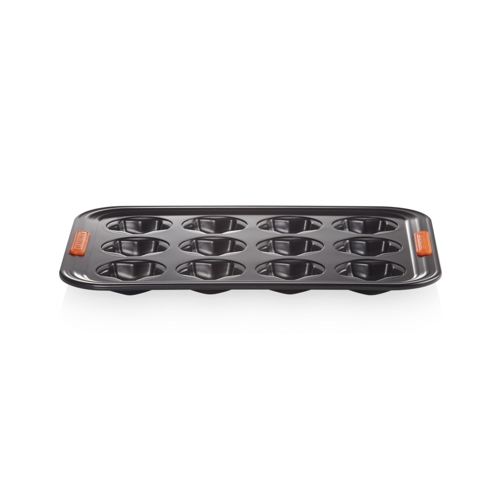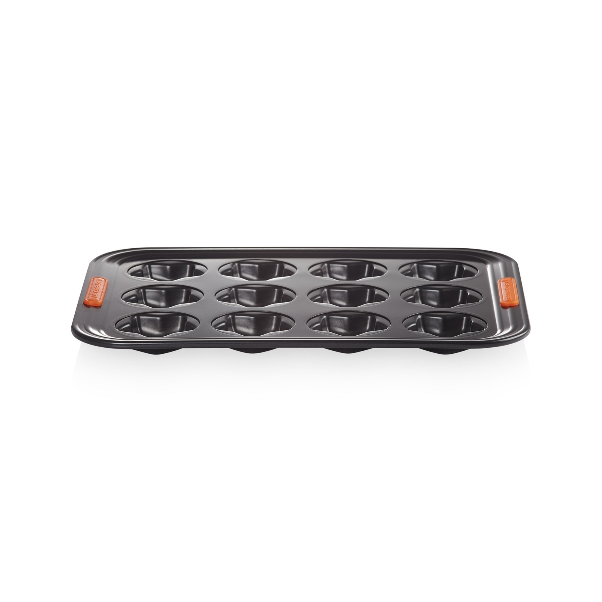 Stampo per 12 muffin a stella realizzato in acciaio al carbonio antiaderente. Con una lunghezza di 40 cm ed una larghezza di 30, questo stampo a 12 coppe profonde a forma di stella è perfetto per creare deliziosi muffin, brioche, cupcake, mini quiche ed una serie di altre delizie! Il rivestimento antiaderente delle coppe, grazie alla proprietà che permette di distribuire il calore uniformemente, impedisce al cibo di attaccarsi e permette una rapida e semplice pulizia! Le impugnature in silicone permettono di afferrare il prodotto con praticità e in sicurezza grazie all'elevata resistenza al calore. Libera la tua creatività con questo esclusivo stampo garantito Le Creuset!