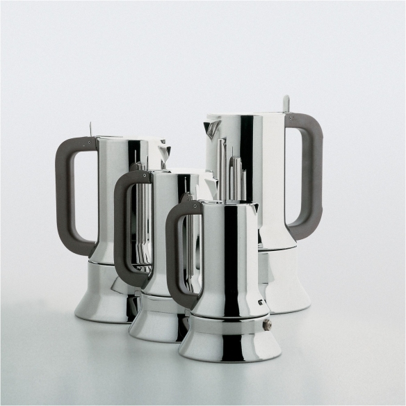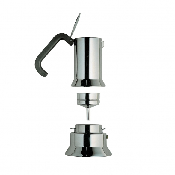 Caffettiera espresso 9090 realizzata in acciaio inossidabile 18/10. Con una capacità di 30 cl (6 tazze), questa caffettiera presenta il fondo in acciaio magnetico, che lo rende adatto a tutte le fonti di calore, induzione compresa. La 9090 è la prima caffettiera della storia di Alessi, vincitrice del Compasso d'Oro e primo oggetto in assoluto di Alessi ad essere esposto al MOMA di New York. Questa caffettiera non solo è molto originale, ma possiede alcune innovazioni funzionali, come la base allargata, che permette di sfruttare al massimo il calore. La 9090 dispone di un pratico beccuccio antigoccia e della chiusura a leva che consente di aprirla molto facilmente. Una caffettiera a 5 stelle! Disegnata da Richard Sapper per Alessi.