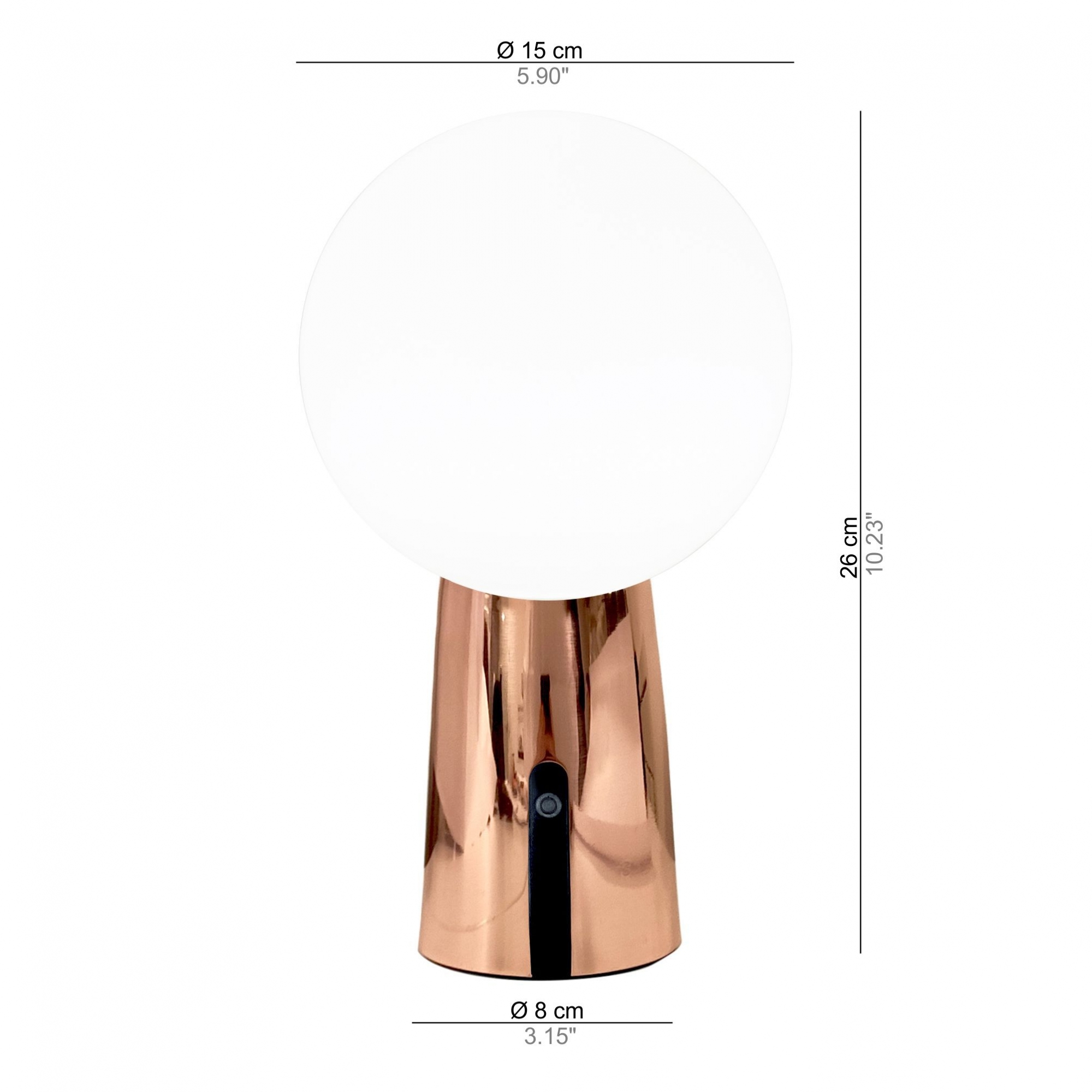 Lampada da tavolo Olimpia Pro Led ricaricabile realizzata con corpo in alluminio verniciato e diffusore in vetro opale satinato soffiato a bocca. Disponibile in 5 eleganti finiture di colore (bianco, grigio scuro, oro, chromo e rame), la lampada da tavolo Olimpia è adatta sia per ambienti interni che esterni. Dotata di base di ricarica a contatto, touch dimmer e di un accessorio per modificare il colore della luce (cover LED9), questa splendida lampada si presenta con un design molto semplice e lineare, paragonabile ad una piccola luna piena appoggiata su un delicato corpo. Estremamente versatile grazie alla batteria con autonomia fino a 9 ore, la lampada Olimpia Pro Led è pronta ad allietare ogni ambiente in modo suggestivo!