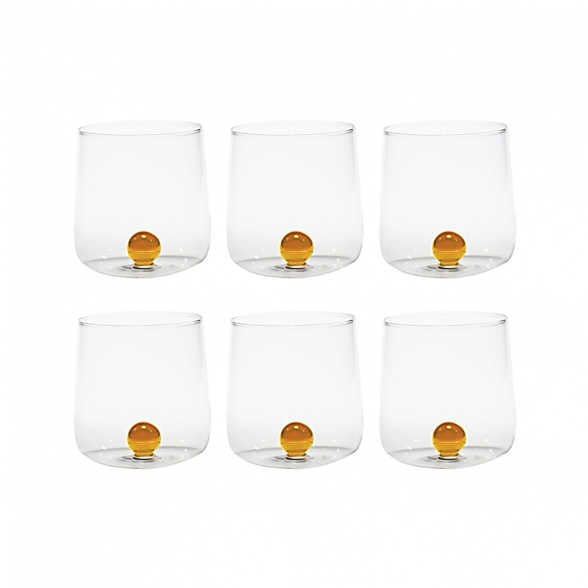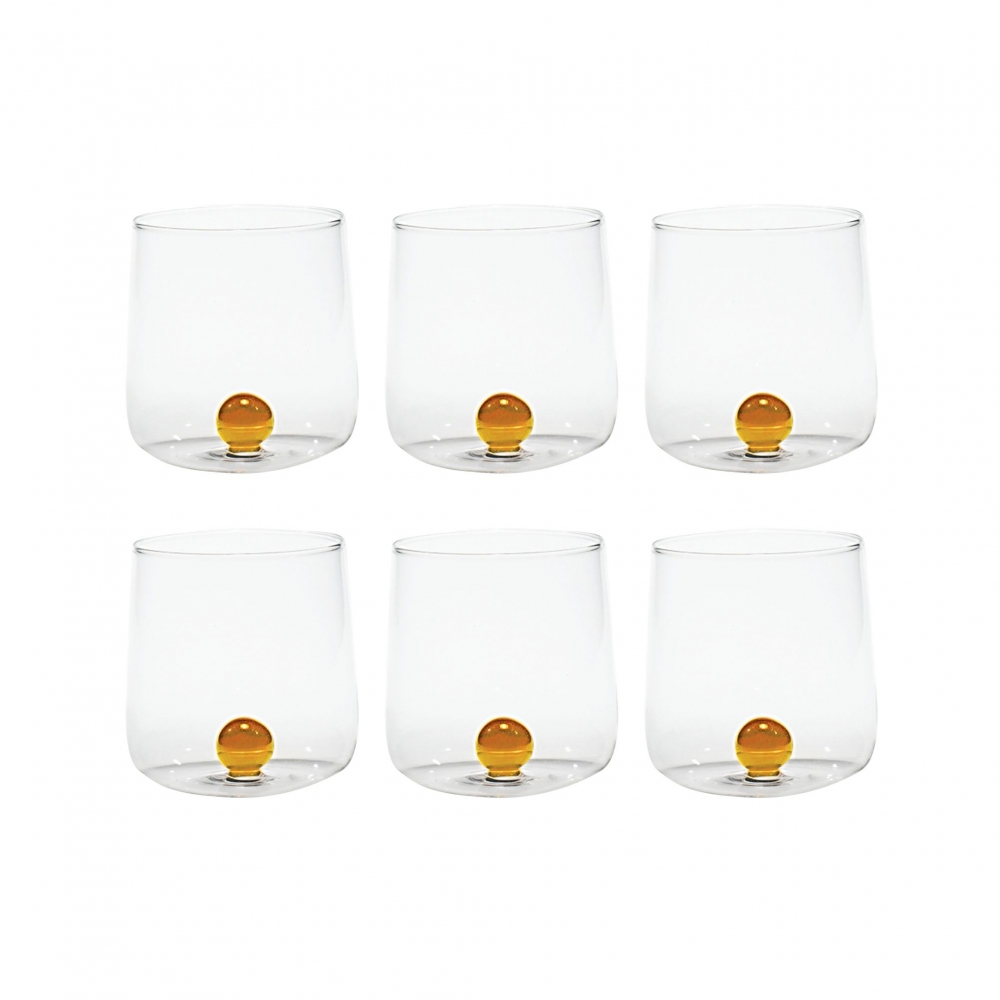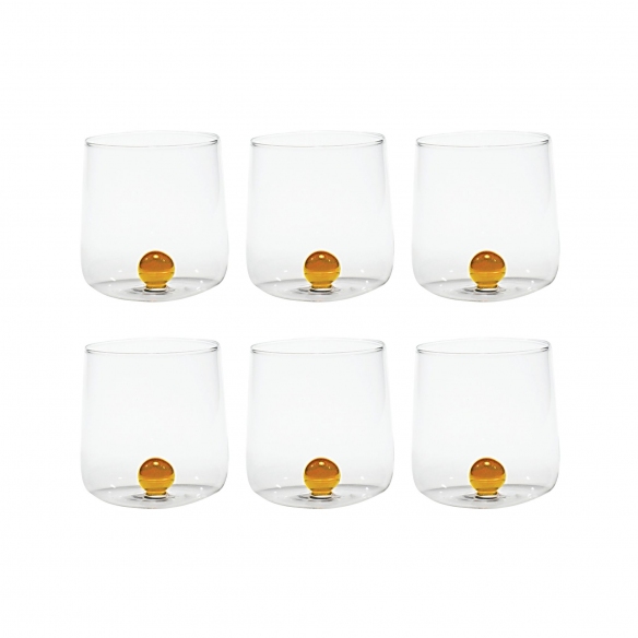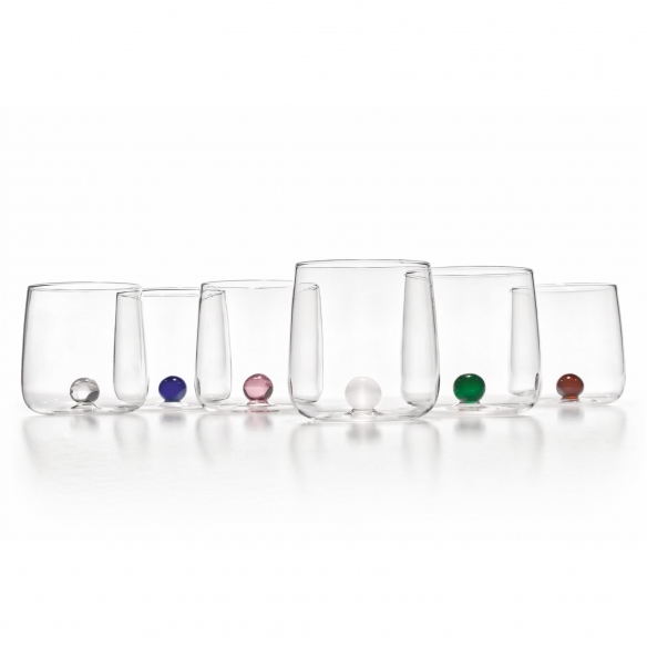 6 bicchieri Bilia realizzati in vetro borosilicato lavorato a mano. Con una capacità di 44 cl, i bicchieri Bilia prendono il nome dalla suggestiva biglia presente all'interno del bicchiere, visibile perfettamente grazie alla trasparenza del vetro. Sono disponibili in 8 eleganti finiture di colore e coloreranno con stile la tua tavola! Disegnati da Federico de Majo per Zafferano.