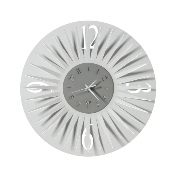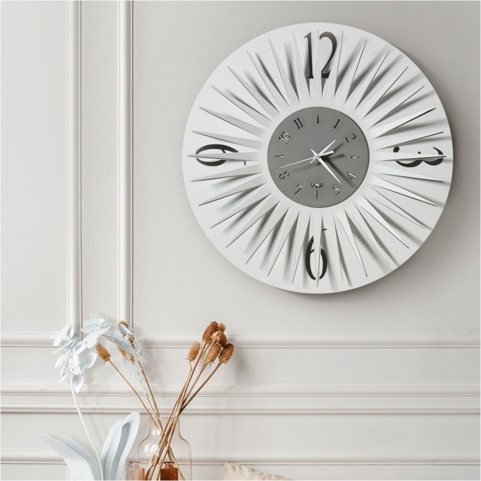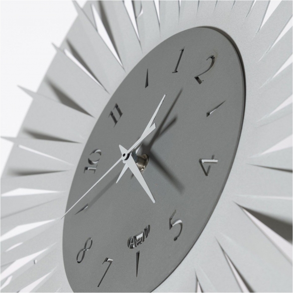 Orologio da parete Sirio realizzato in ferro con un semplice quadrante centrale e una cornice con punte in rilievo, ispirato alla stella bianca Sirio. Disponibile in due combinazioni colore (bianco marmo-alluminio e avorio-sabbia). Il ferro è il materiale di punta del brand che viene tagliato a laser per mescolarsi con i colori e restituire un mood leggero e contemporaneo. Realizzato da Arti e Mestieri.