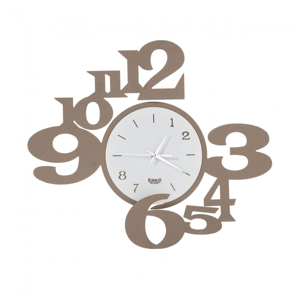Orologio da parete King realizzato in ferro con quadrante centrale circondato da grandi numeri dallo stile doppio. Il numero 1, 2, 8 e 7 rimangono nel quadrante, mentre gli altri numeri di estendono e fuoriescono da esso. Il ferro è il materiale di punta del brand che viene tagliato a laser per mescolarsi con i colori e restituire un mood leggero e contemporaneo. Disponibile in tre combinazioni colore (nero-bianco, fango-avorio e beige-bianco). Realizzato da Arti e Mestieri.