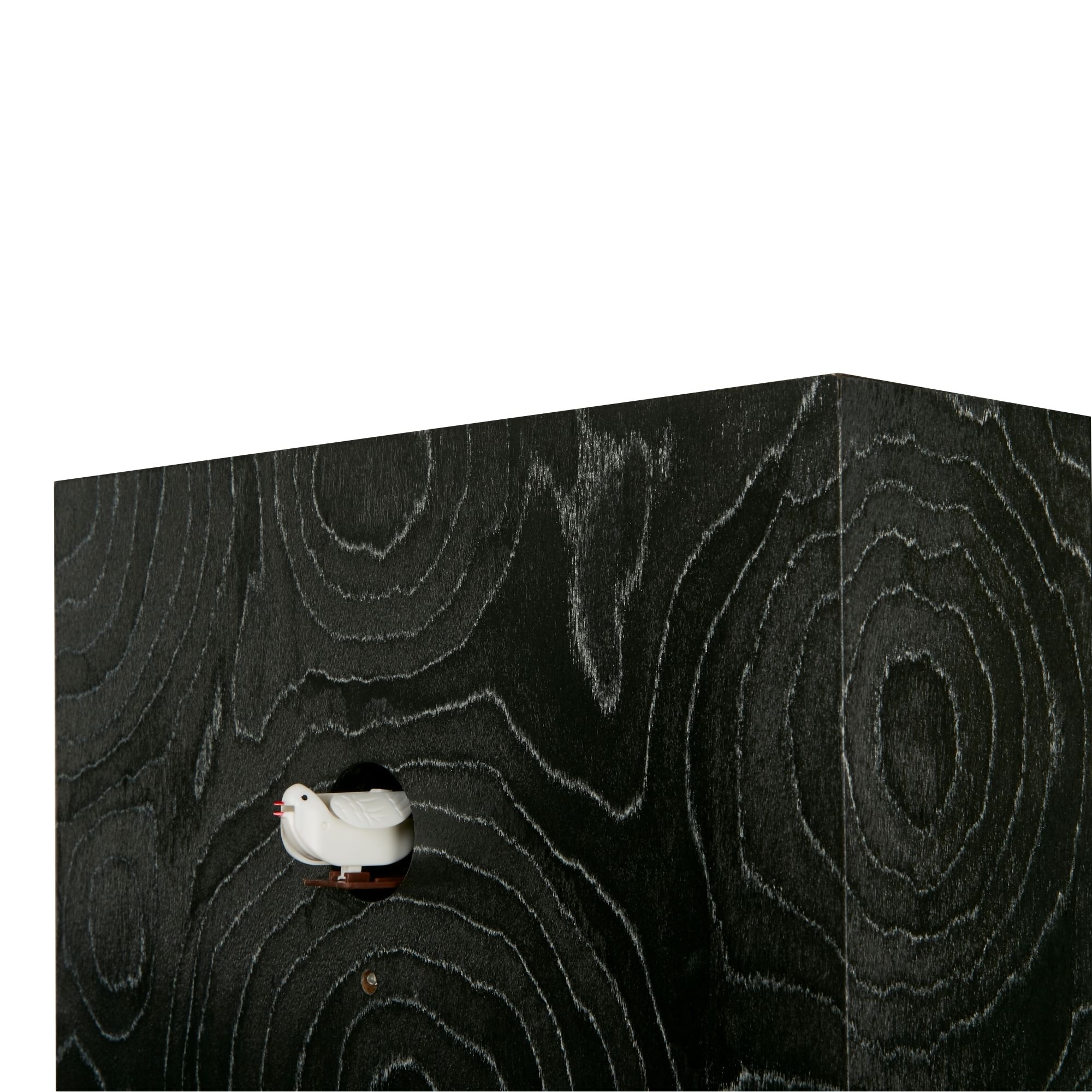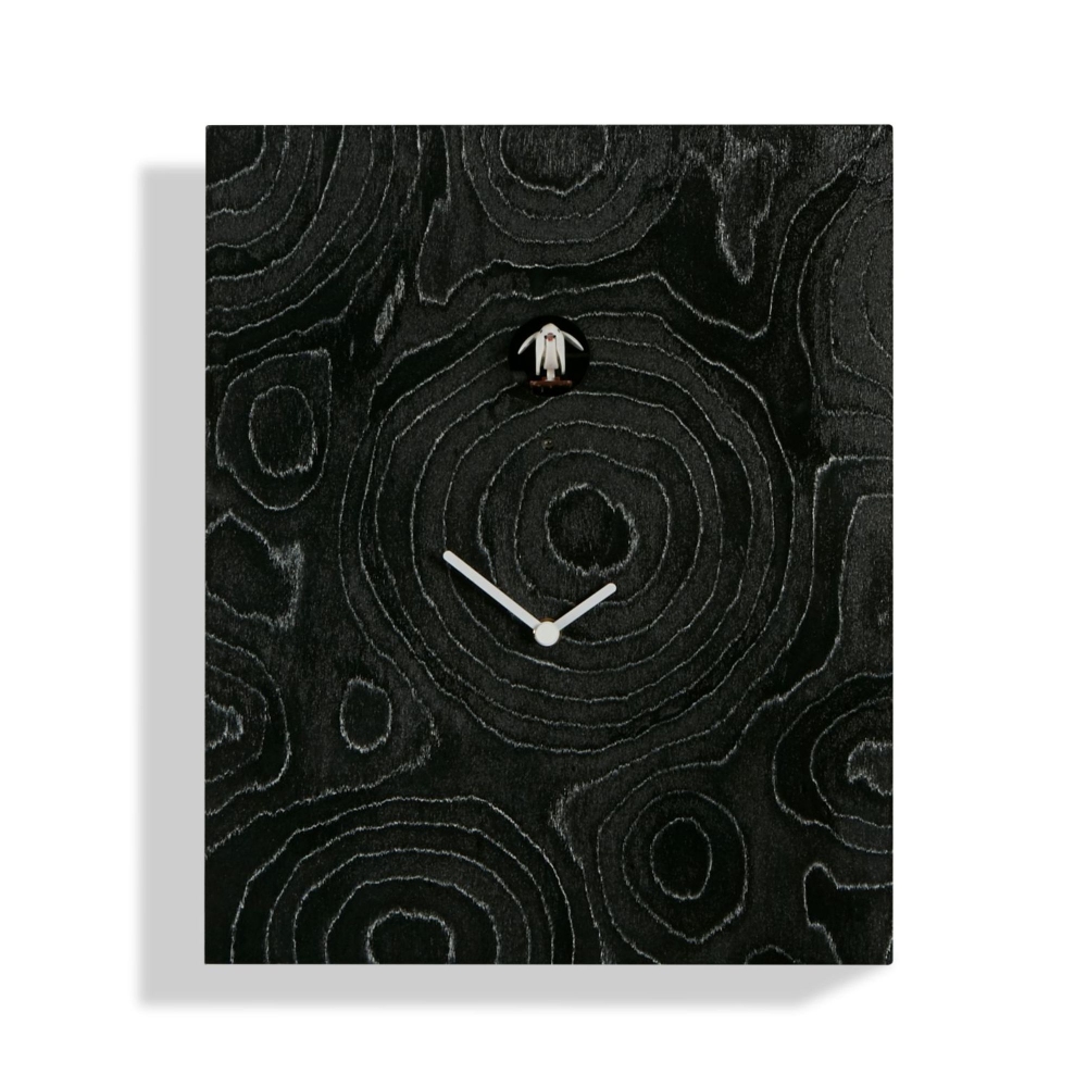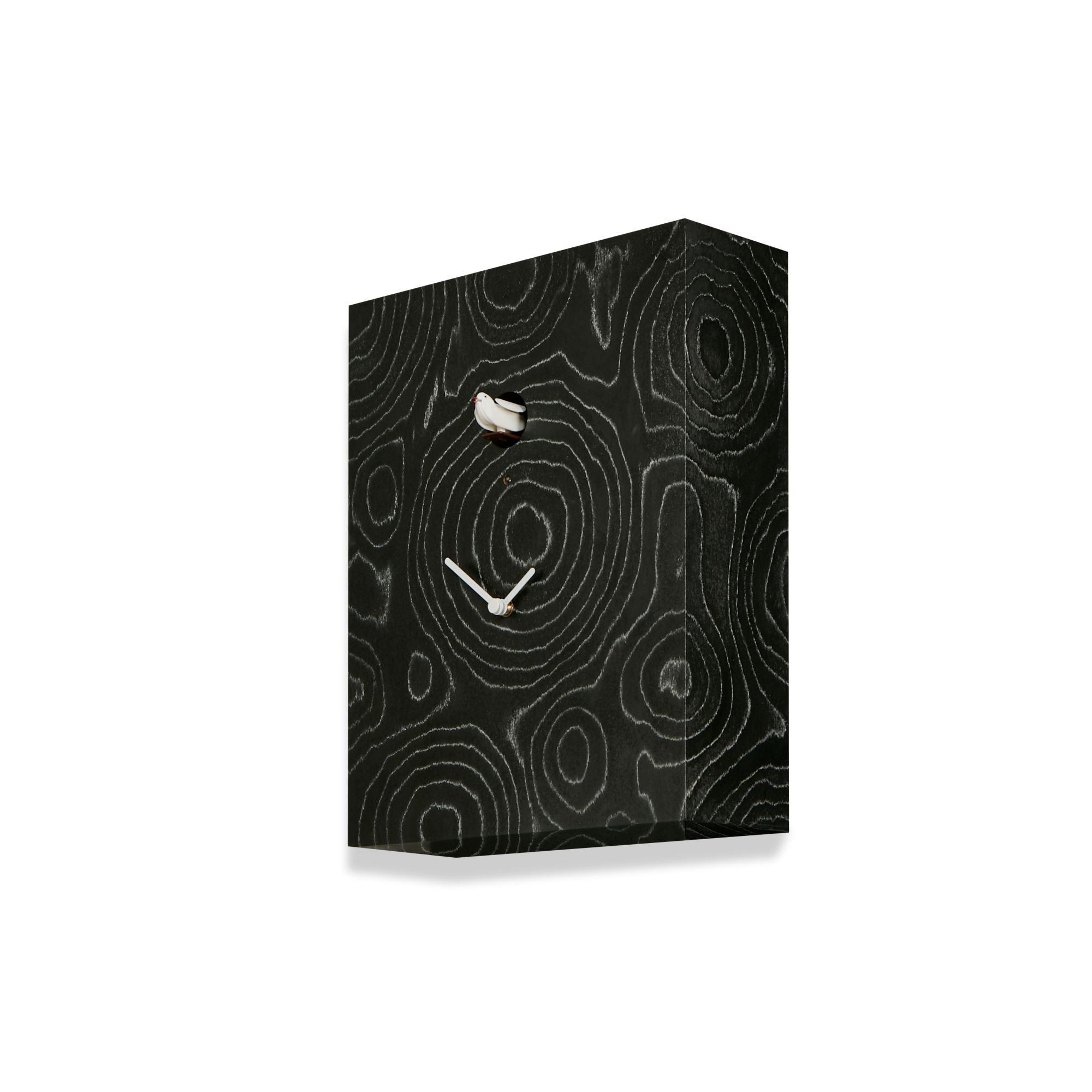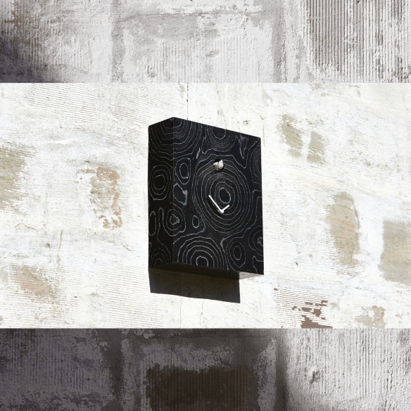 Orologio a cucù Campana realizzato in cassa in MDF impiallacciata e tinta lucida. Si presenta con delle venature tipiche del legno di colore bianco che contrastano il nero dell’intera struttura. Le lancette hanno piccole dimensioni e si disperdono nella dinamicità delle striature. Orologio a cucù Campana ha la forma di un parallelepipedo, con annesso uccellino che fuoriesce dalla cassa di legno stessa. Disponibile solo in nero, questo orologio è un mix tra comodità e stravaganza. Disegnato da Bramasangue per Domeniconi.