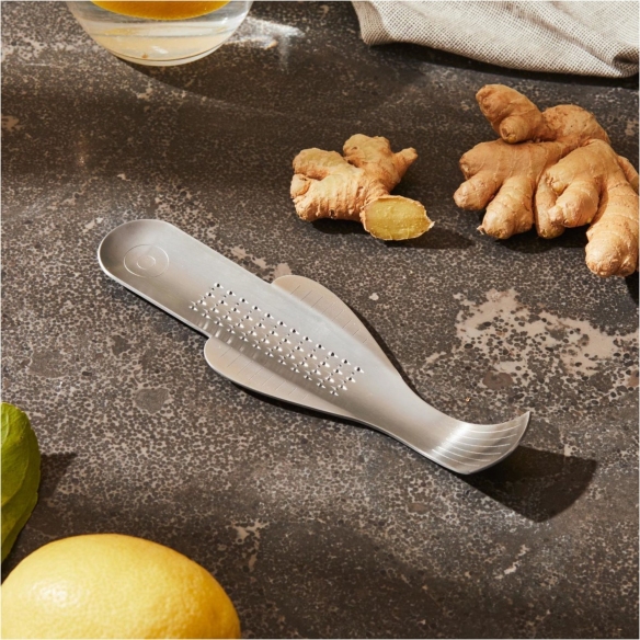 Grattugia per zenzero Boga realizzata in acciaio AISI 430 satinato. Con un design ispirato ad un pesce, da cui appunto prende anche il nome, la grattugia Boga è l'ideale sia per sbucciare che grattugiare le radici di zenzero in modo sicuro, igienico e senza sprechi. Un oggetto dal design inimitabile in grado di stupire amici e parenti! Disegnata Valerio Sommella per Alessi.