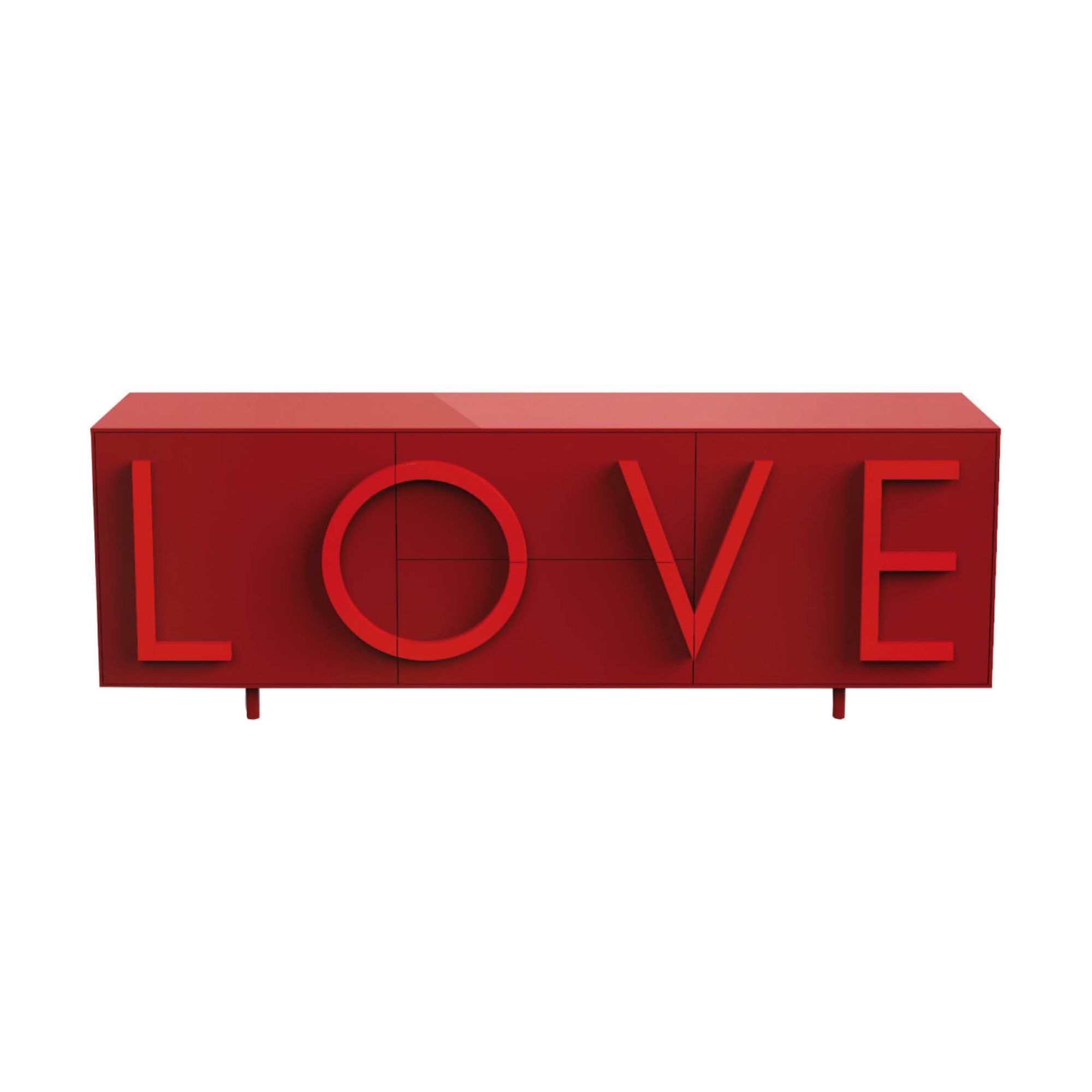 Madia Love realizzata in MDF laccato. Disponibile in ben 14 combinazioni di colore, la madia Love stupisce a primo impatto per il messaggio che riesce a trasmettere. Dal connubio tra estetica e funzione, le linee diventano tridimensionali, il foglio si estrude diventando contenitore e le lettere escono dal foglio generando delle maniglie. Una madia che si trasforma in poster, un complemento d'arredo che vuole ricordare che l'amore è una scatola chiusa, tutta da scoprire. Disegnata da Fabio Novembre per Driade.