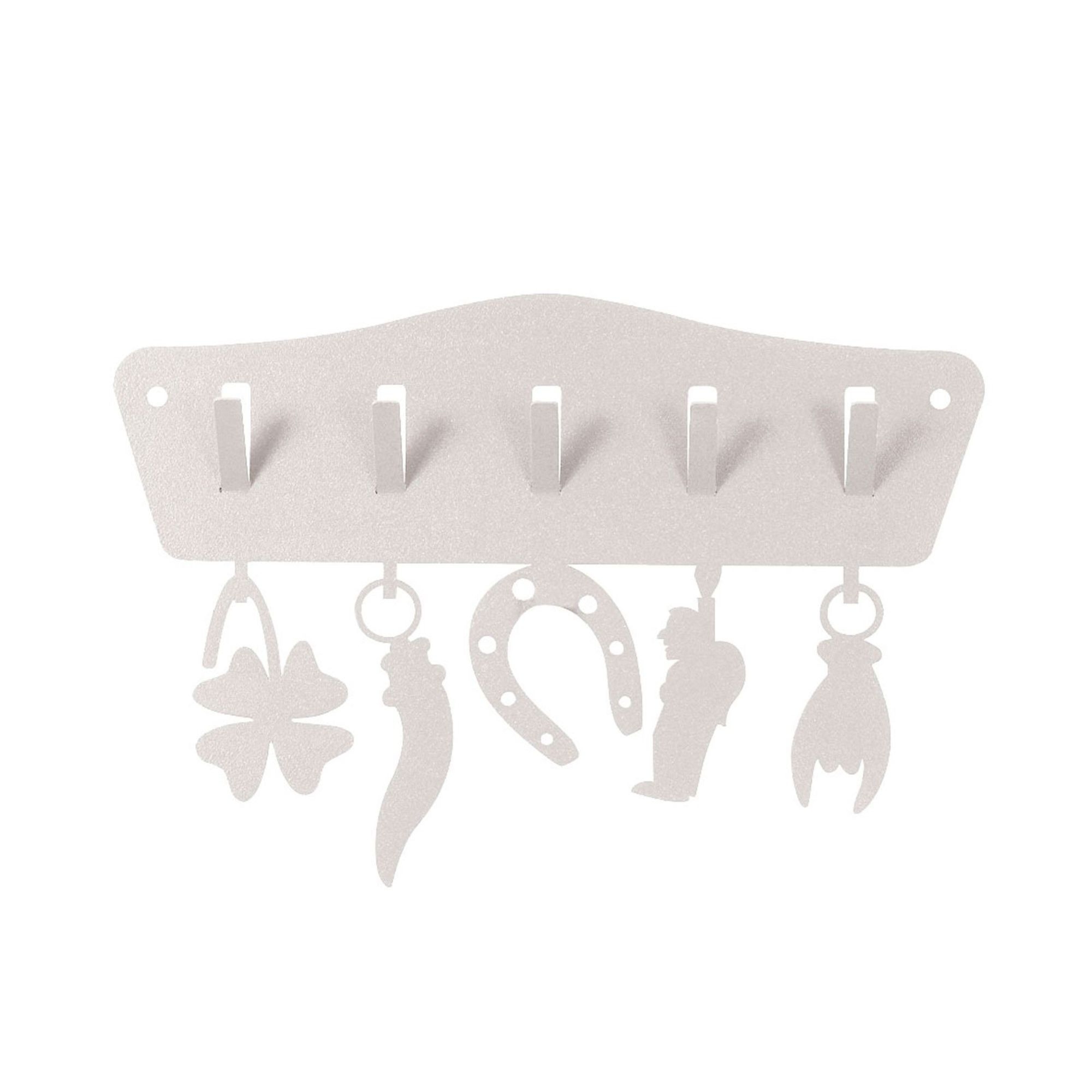 Porta chiavi Toccaferro realizzato in ferro con cinque ganci, si sviluppa in orizzontale e ha la forma di un classico portachiavi ma con bellissime decorazioni porta fortuna. Disponibile in tre varianti colore (bianco, nero e rosso). Il ferro è il materiale di punta del brand che viene tagliato a laser per mescolarsi con i colori e restituire un mood leggero e contemporaneo. Porta chiavi Toccaferro ti accoglierà quando rientrerai stanco da una pesante giornata di lavoro, conferendoti tutto il confort che meriti. Realizzato da Arti e Mestieri.
