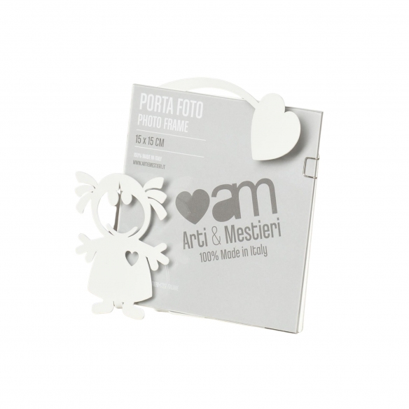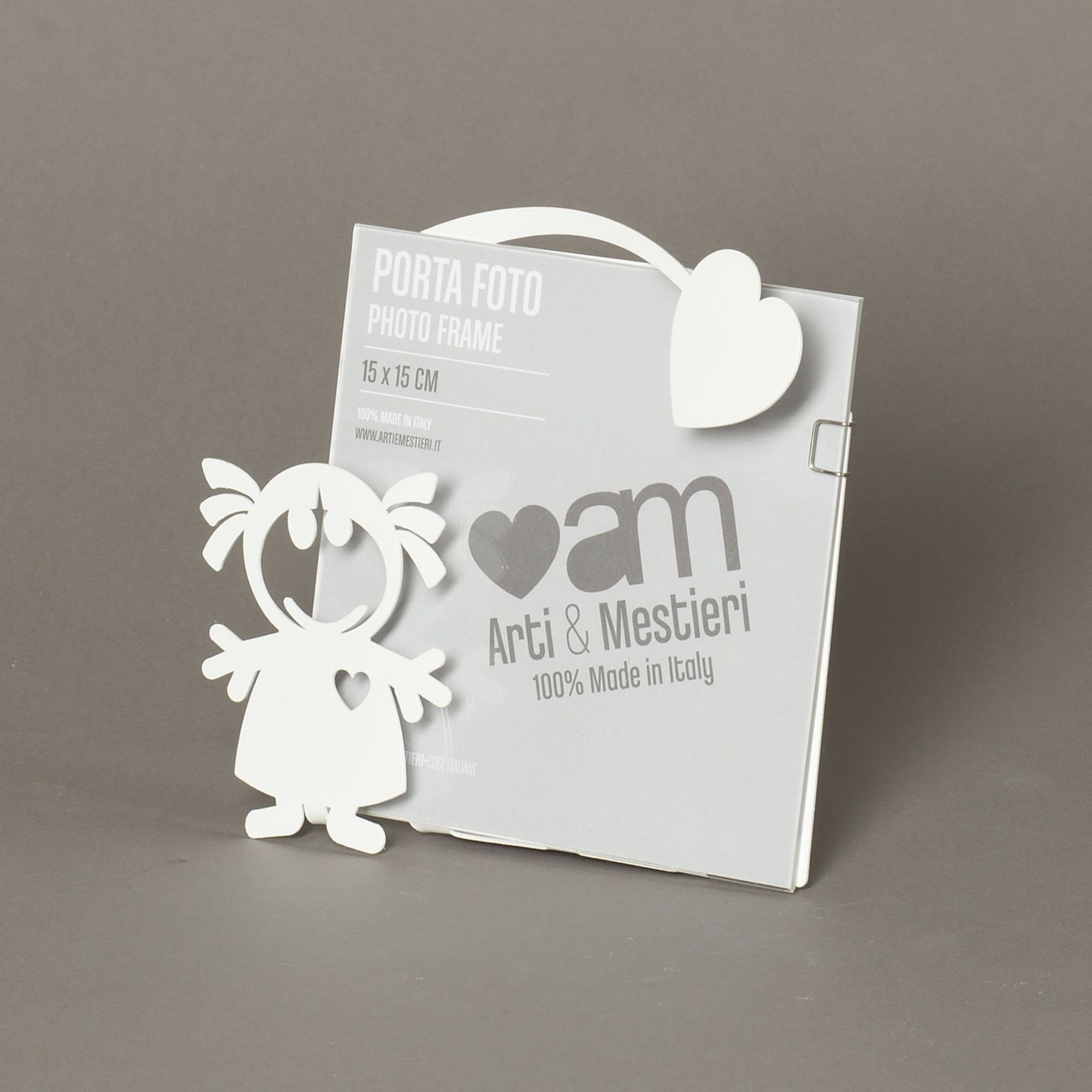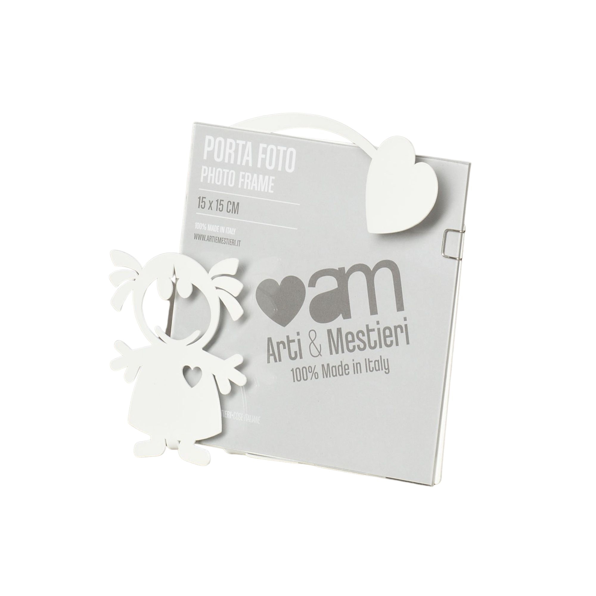 Porta foto Bibo realizzato in ferro. La cornice è abbellita da decorazioni infantili, come una piccola donnina e un cuore. Disponibile in bianco, è perfetta per arredare la cameretta dei tuoi bambini. Porta foto Bibo in ferro è solido e decorativo e abbellirà le tue superfici vuote con i ricordi più belli. Realizzato da Arti e Mestieri.