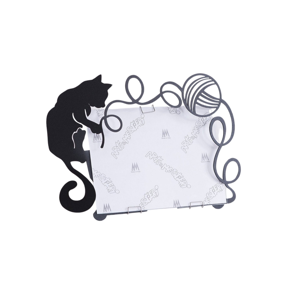 Porta foto Gatto Gomitolo  realizzato in ferro. La cornice è abbellita da un gatto e l'immancabile gomitolo. Ha uno stile moderno e simpatico, disponibile in nero. Porta foto Gatto Gomitolo in ferro è solido e decorativo e abbellirà le tue superfici vuote con i ricordi più belli. Realizzato da Arti e Mestieri.