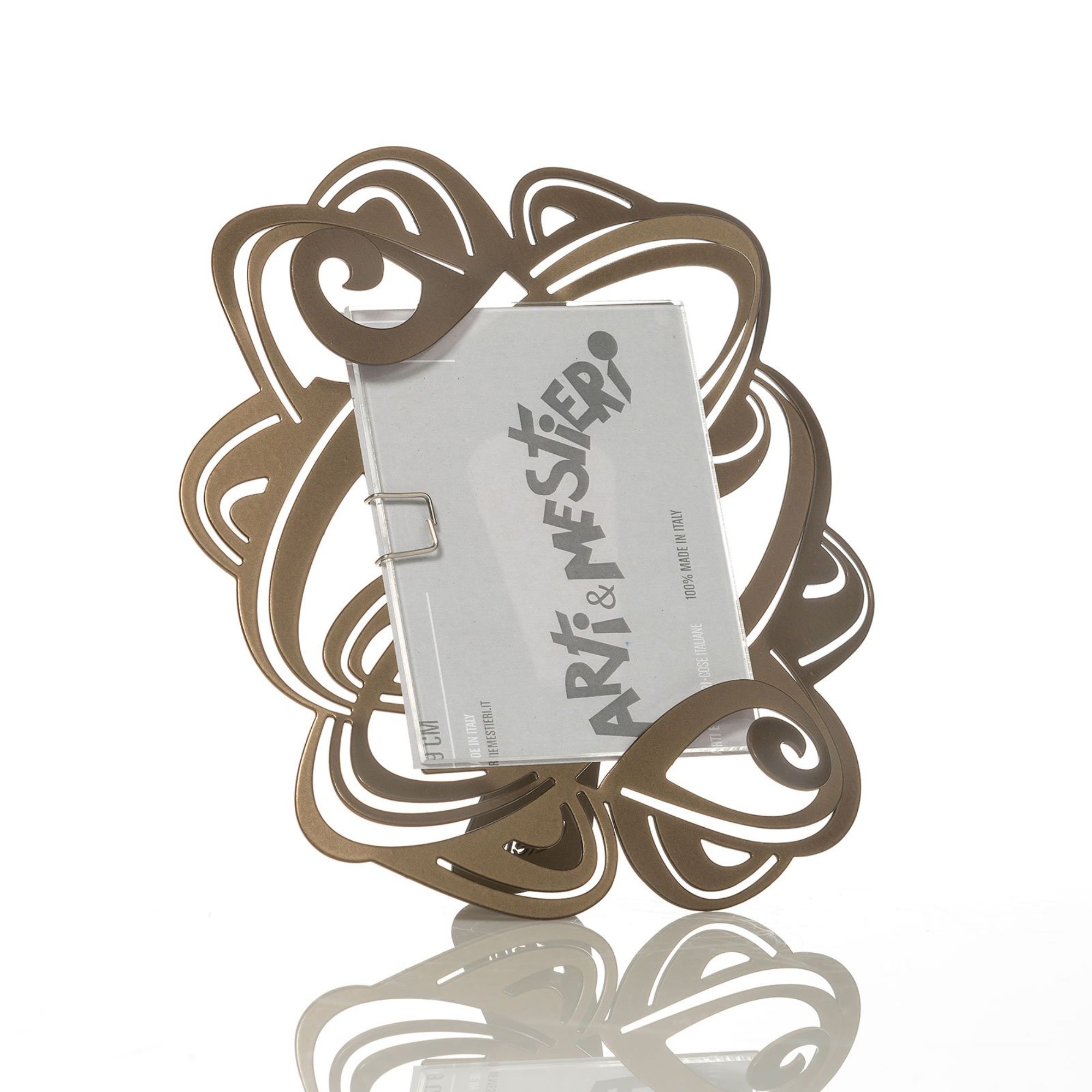 Porta foto Penelope realizzato in ferro. La cornice si compone di linee sinuose e curve che conferiscono grande dinamicità alle superfici in cui viene posto. Disponibile in bianco, bronzo e sabbia. Porta foto Penelope in ferro è solido e decorativo e abbellirà le tue superfici vuote con i ricordi più belli. Realizzato da Arti e Mestieri.