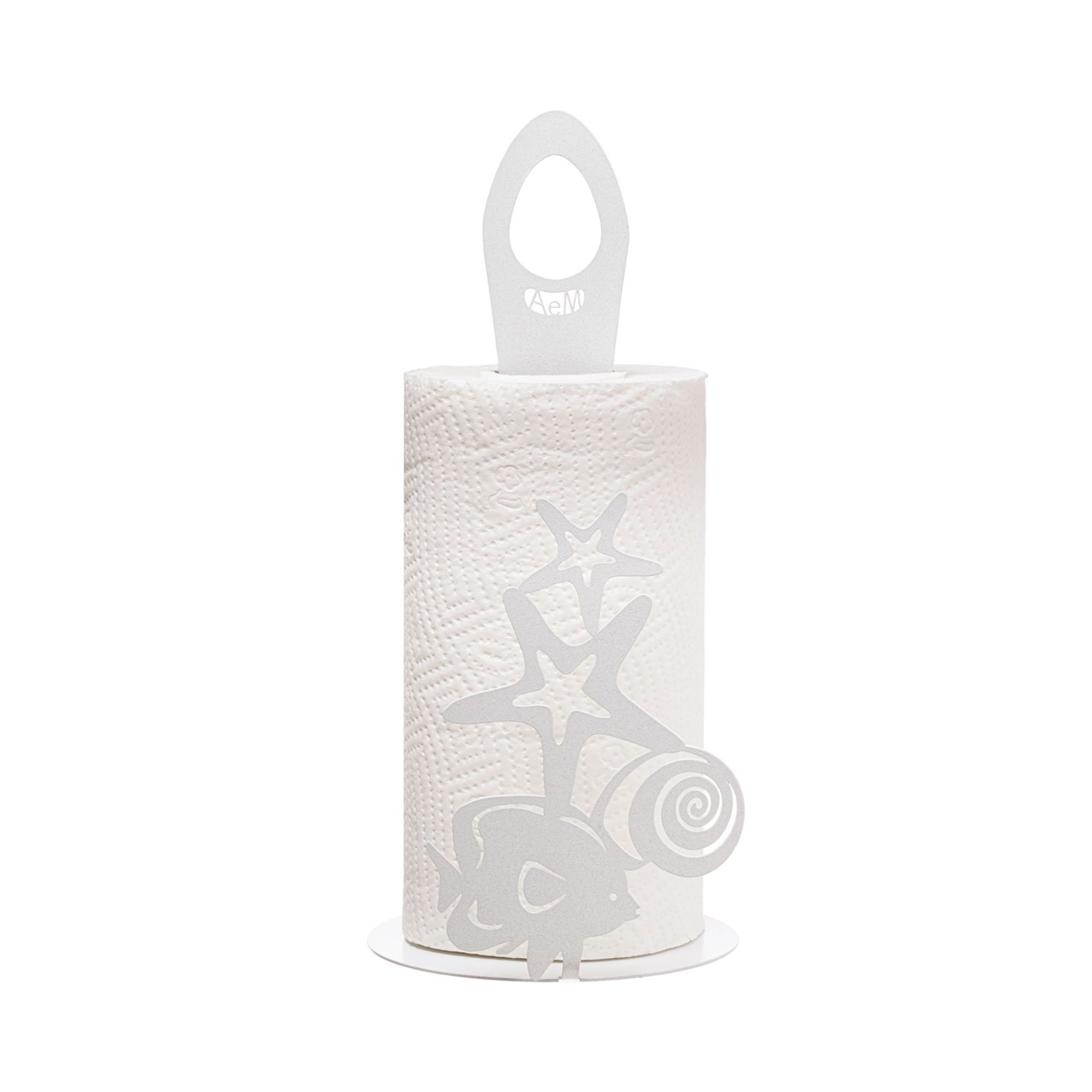 Porta rotolo Nettuno realizzato in ferro con manico porta scottex e struttura con stelle di mare, conchiglie e pesci. Pratico e funzionale è disponibile in tre colori. Il ferro è il materiale di punta del brand che viene tagliato a laser per mescolarsi con i colori e restituire un mood leggero e contemporaneo. Realizzato da Arti e Mestieri.