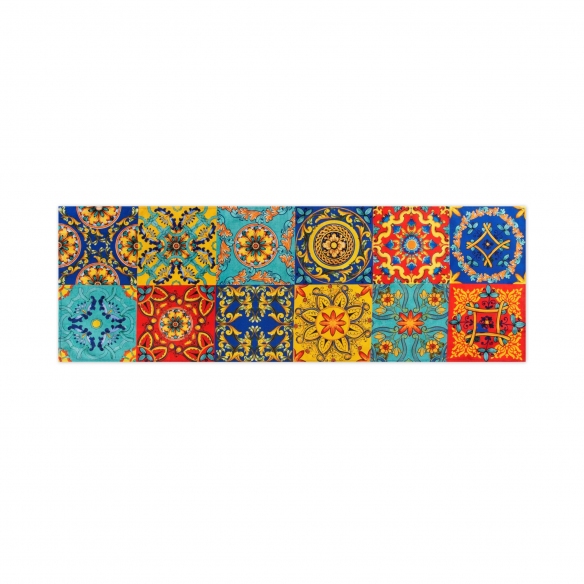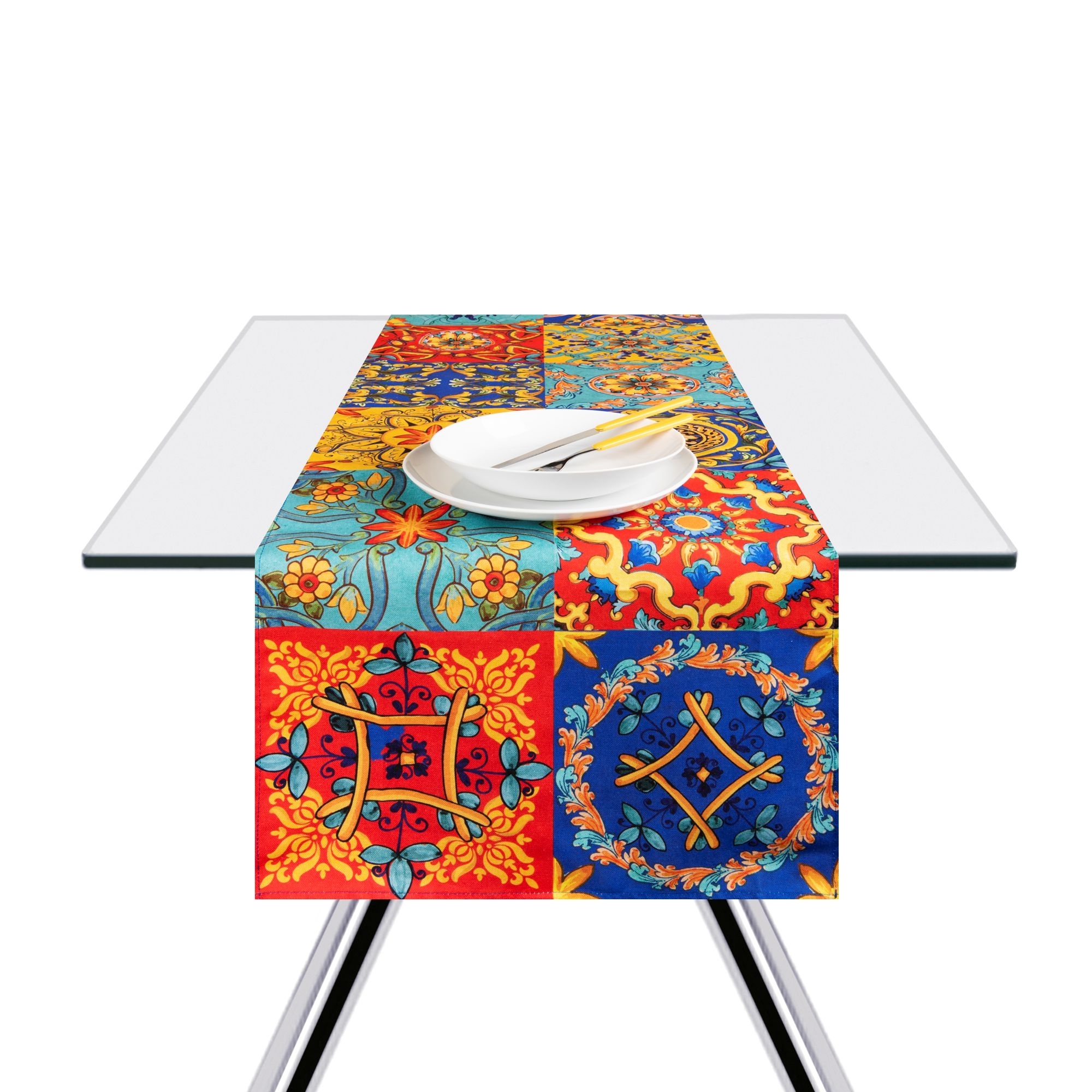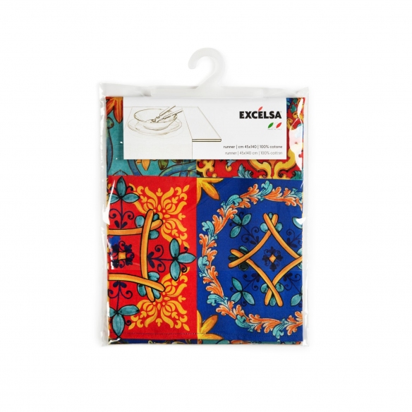 Runner 45x140 cm della collezione Trinacria, realizzato in cotone al 100%. Ideale per decorare suggestivamente la tua tavola, il runner Trinacria è contraddistinto da una serie di diversi decori, ispirati all'arte siciliana. Dai colori forti e decisi, il runner Trinacria è perfetto per ogni occasione e si adatta ad ogni tavola, grazie alle generose dimensioni. Progettato e realizzato da Excelsa.