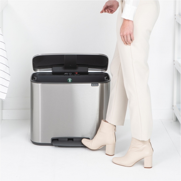 Pattumiera a pedale Bo, realizzata in lega d'acciaio con cestino interno in plastica riciclata. Con una capacità di 36 litri, la pattumiera Bo si presenta con un design lineare, compatto e salvaspazio, risultando anche molto igienica grazie al pedale ed il coperchio che si chiude delicatamente. Presenta delle gambe antiscivolo regolabili, che la rendono molto stabile e posizionabile perfettamente alla parete. Disponibile in 6 eleganti e versatili finiture di colore, la pattumiera Bo ha un sistema di chiusura "Soft Touch", che permette un'utilizzo pratico e silenzioso, con un solo tocco di mano! Progettata e realizzata da Brabantia.