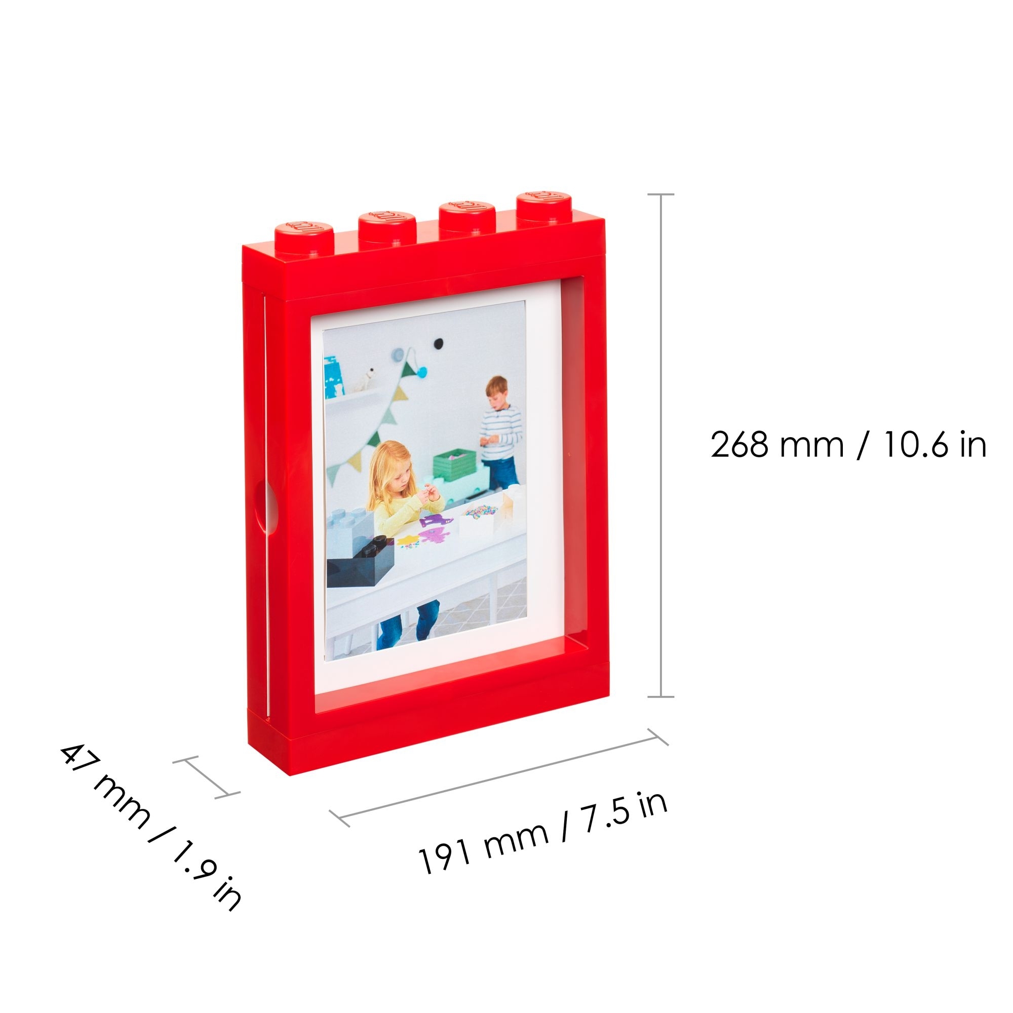 Cornice portafoto, realizzata in plastica PVC. E' disponibile in 4 diverse colorazioni, il design si ispira agli storici mattoncini colorati, potrai mettere in evidenza le tue foto preferite con stile! Sono compatibili con le vetrine per minifigure, e sono abbastanza profonde da contenere i piccoli personaggi Lego®. Potrai scegliere di appenderla a muro o semplicemente adagiarla su tavoli o mensole. Un accessorio perfetto per ogni stanza del tuo ambiente domestico! Ideale per tutti i formati di foto. Progettata e realizzata da Lego®.