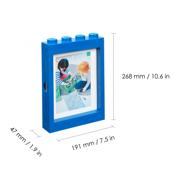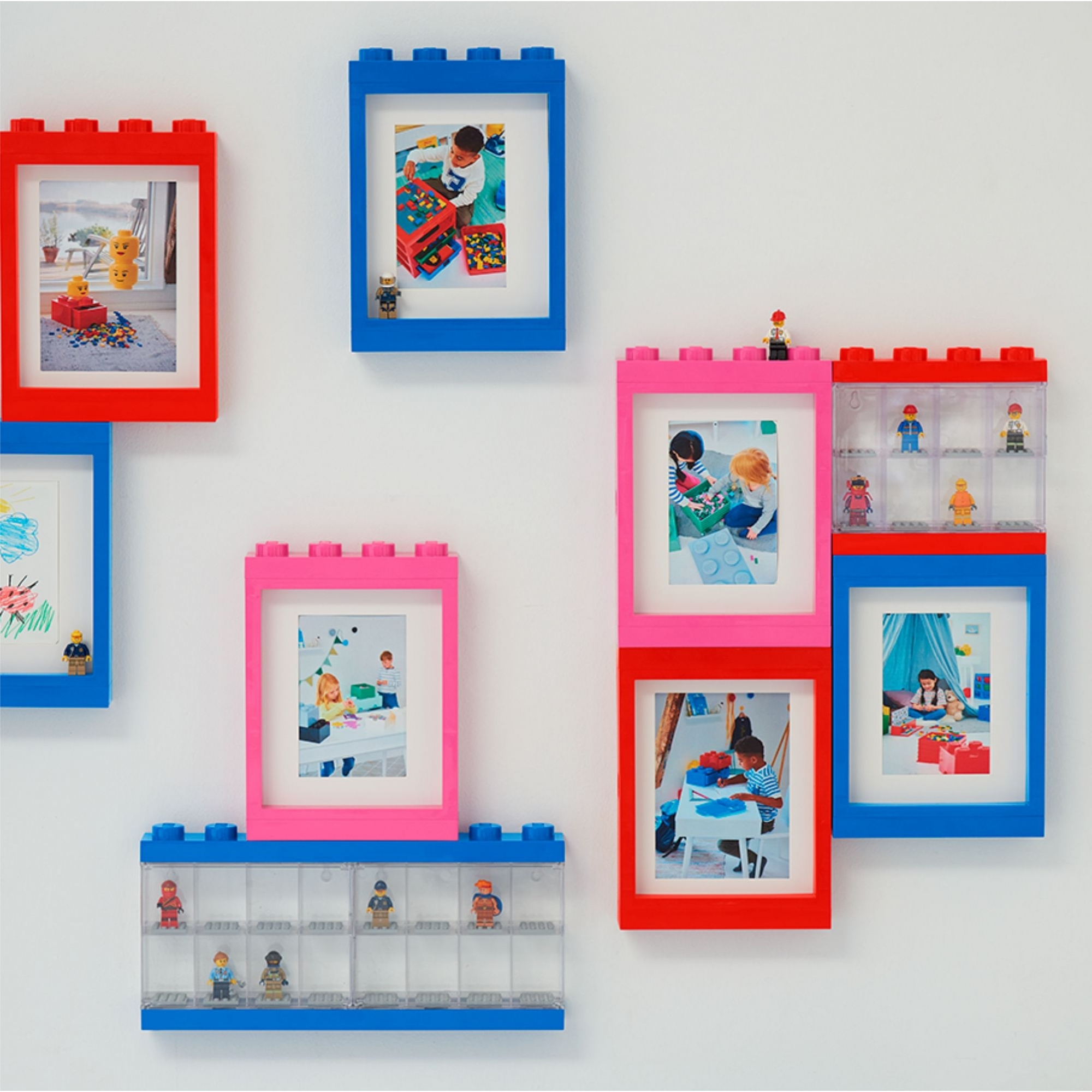 Cornice portafoto, realizzata in plastica PVC. E' disponibile in 4 diverse colorazioni, il design si ispira agli storici mattoncini colorati, potrai mettere in evidenza le tue foto preferite con stile! Sono compatibili con le vetrine per minifigure, e sono abbastanza profonde da contenere i piccoli personaggi Lego®. Potrai scegliere di appenderla a muro o semplicemente adagiarla su tavoli o mensole. Un accessorio perfetto per ogni stanza del tuo ambiente domestico! Ideale per tutti i formati di foto. Progettata e realizzata da Lego®.