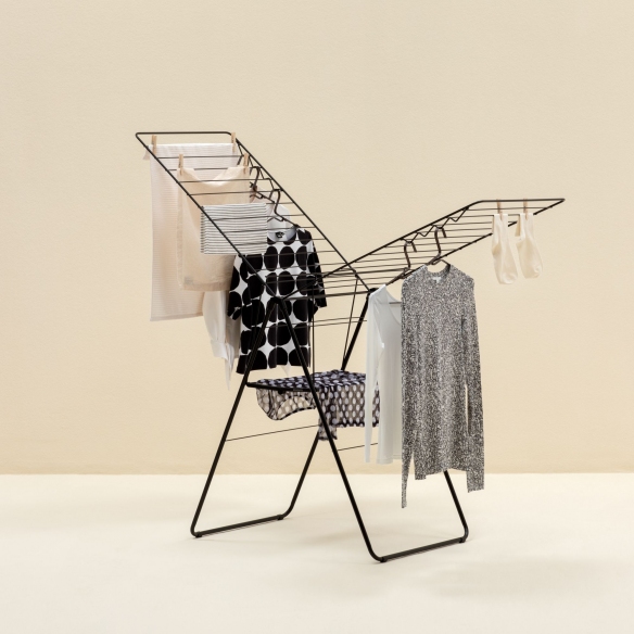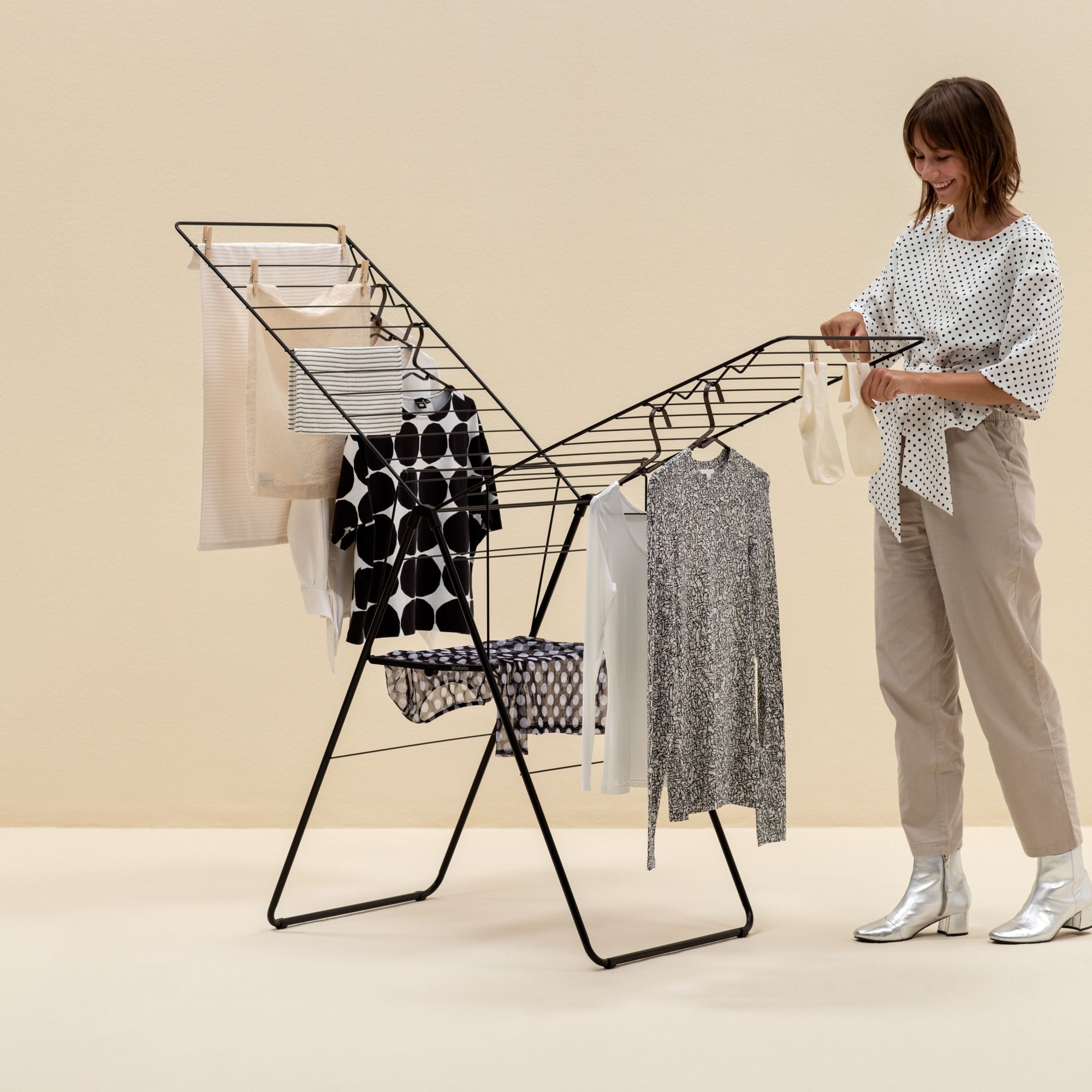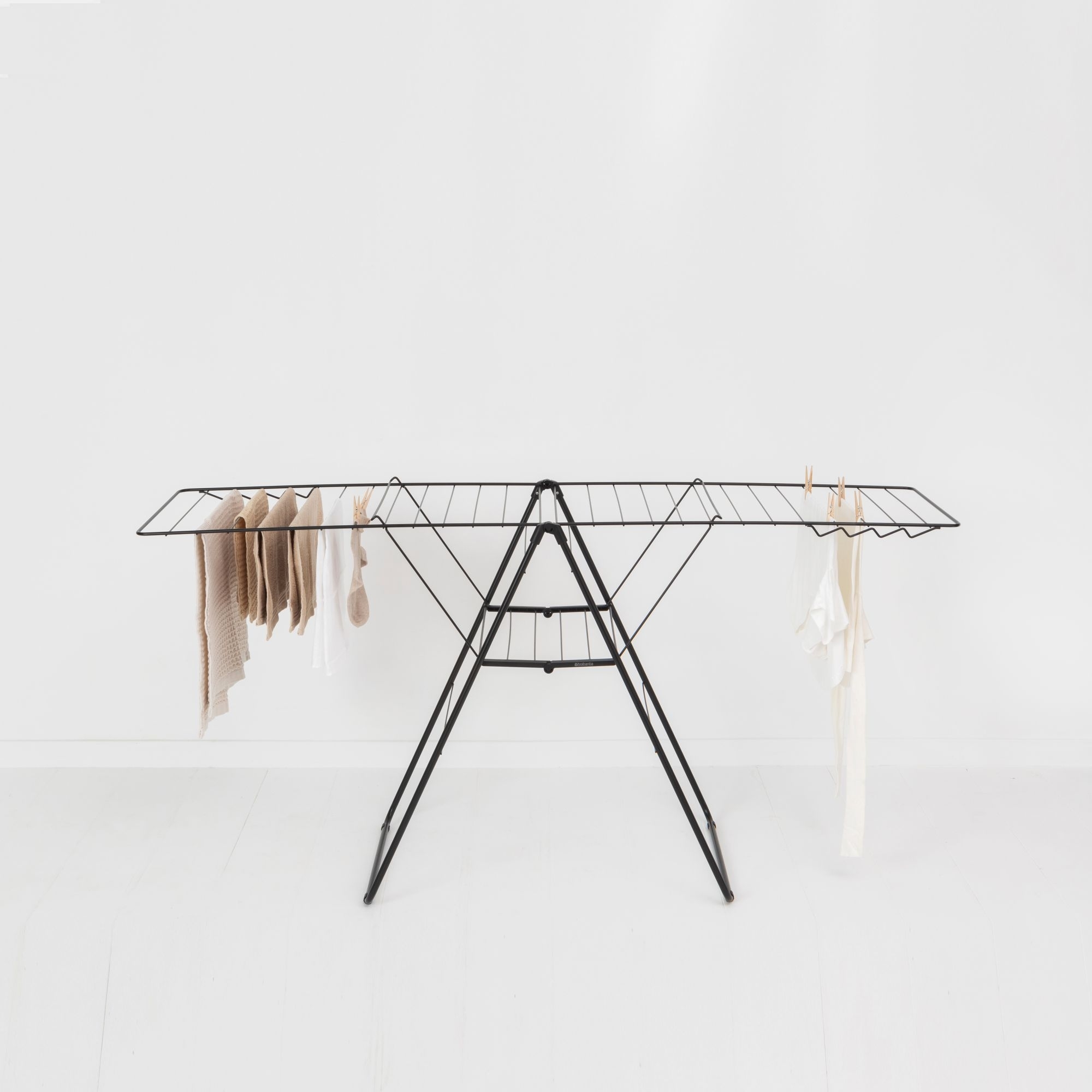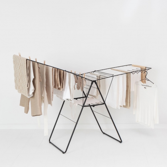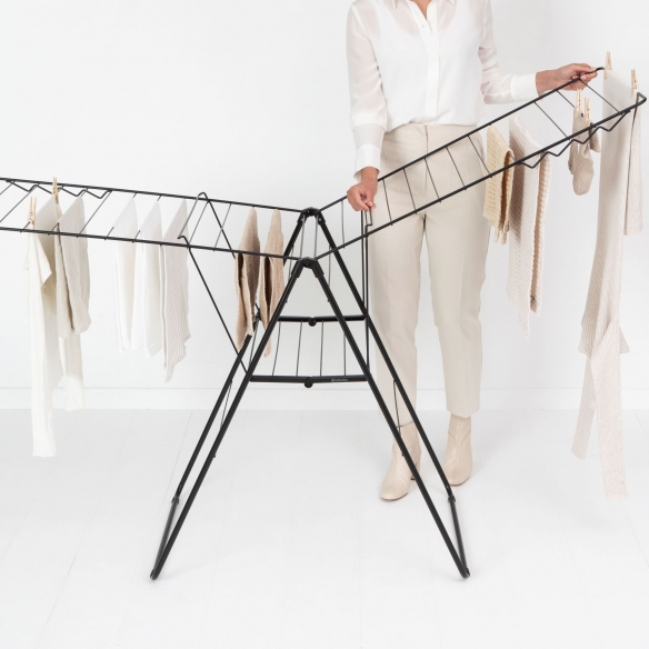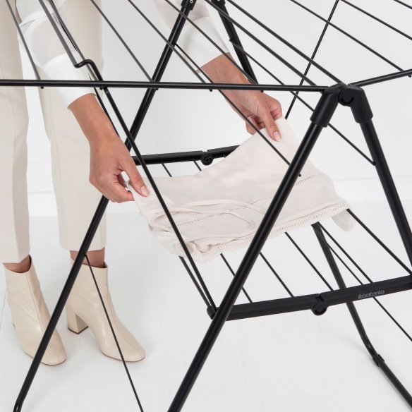 Stendibiancheria della collezione HangOn, dalla lunghezza di 25 metri, realizzato in metallo resistente. Disponibile in 3 finiture di colore, HangOn è un accessorio immancabile nella tua casa: è leggero, pratico, compatto e sfrutta lo spazio in modo intelligente! Può accogliere fino a 3 carichi di bucato e l'altezza delle ali è regolabile! Le dimensioni rimangono contenute, sia una volta ripiegato sia quando chiuso. I piedini di protezione robusti evitano di rovinare il pavimento e garantiscono grande stabilità. Lo stendino per eccellenza! Progettato e realizzato da Brabantia.