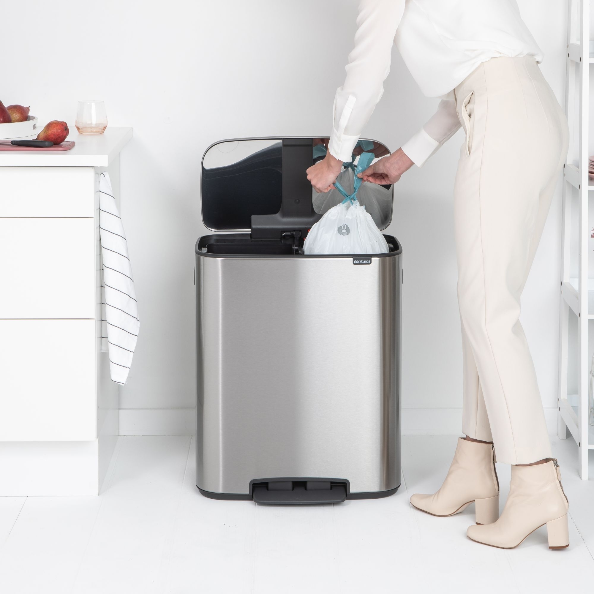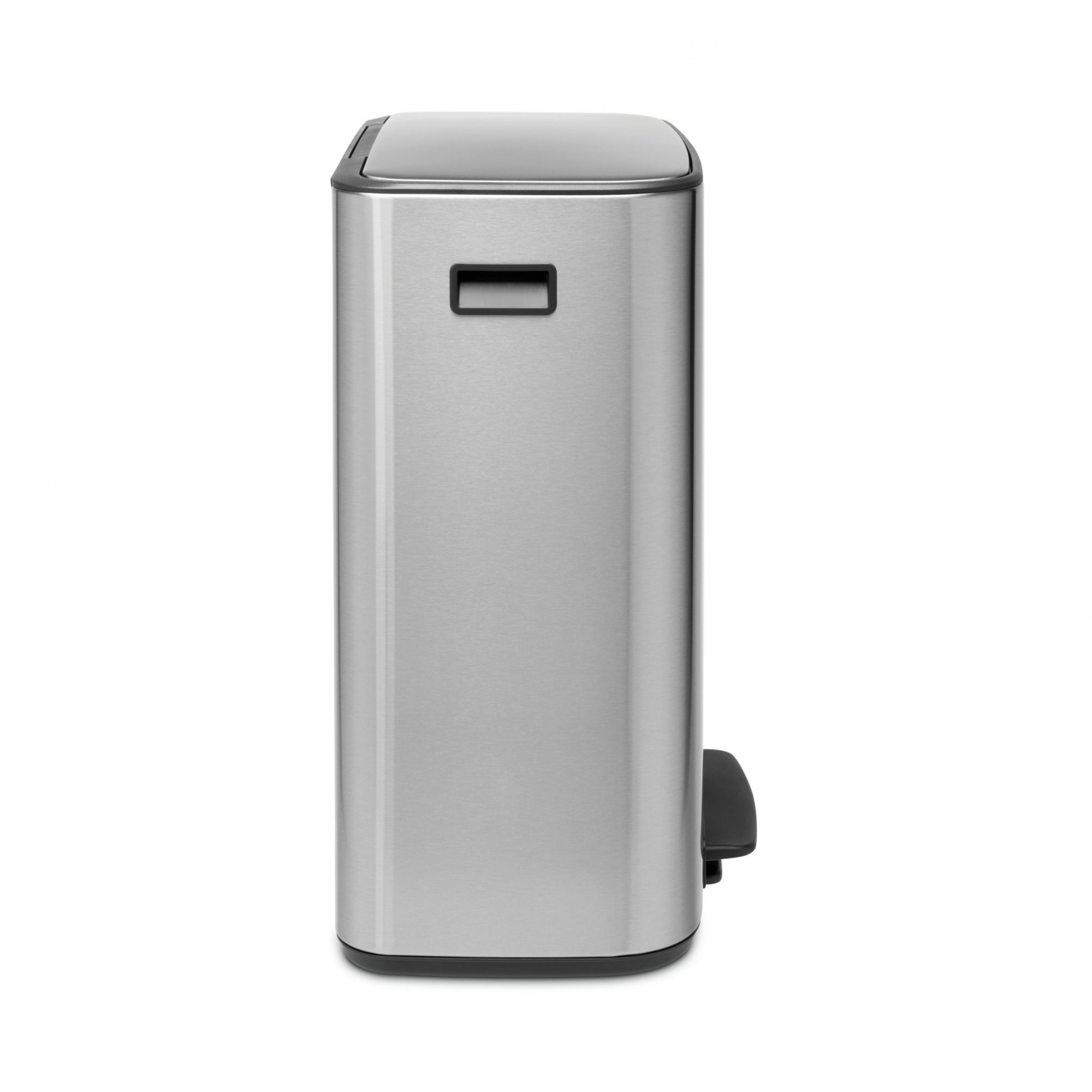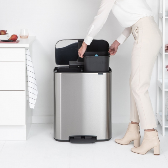 Pattumiera a pedale Bo, realizzata in lega d'acciaio con cestino interno in plastica riciclata. Con una capacità di 60 litri (2 scomparti da 30 litri), la pattumiera Bo si presenta con un design lineare, compatto e salvaspazio, risultando anche molto igienica grazie al pedale ed il coperchio che si chiude delicatamente. Presenta delle gambe antiscivolo regolabili, che la rendono molto stabile e posizionabile perfettamente alla parete. Disponibile in 6 eleganti e versatili finiture di colore, la pattumiera Bo ha un sistema di chiusura "Soft Touch", che permette un'utilizzo pratico e silenzioso, con un solo tocco di mano! Progettata e realizzata da Brabantia.