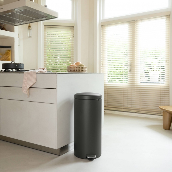 Pattumiera a pedale con capacità 30 litri, appartenente alla collezione NewIcon, realizzata in metallo con secchio interno in plastica. Disponibile in 13 finiture colore, NweIcon è una vera e propria icone del pulito. Inserire e togliere il sacchetto è semplicissimo, il secchio interno con fori di ventilazione evita l'effetto sottovuoto, mentre un particolare meccanismo nasconde il sacchetto quando chiusa. Questa pattumiera dal design senza tempo ed igienica, si apre con un leggero tocco del pedale, è anti odore e ha una chiusura ammortizzata. Altri vantaggi: la base antiscivolo che la mantiene sempre ferma, e, naturalmente, il look iconico. Impossibile non amarla! Disegnata e progettata da Brabantia.