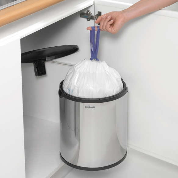 Pattumiera Built-in da incasso realizzata in accaio, con capacità da 15 l.  L’apertura è automatica con l'anta, adatta sia per apertura a destra che a sinistra. Bult-in è Facile da fissare in quasi tutti i mobili da cucina e presenta i materiali per l’installazione. Disponibili sacchetti rifiuti Brabantia a misura perfetta, quando installati sono della lunghezza giusta e non si vedono quando la pattumiera è chiusa, sacchetto codice D. Disegnata e prodotta da Brabantia.