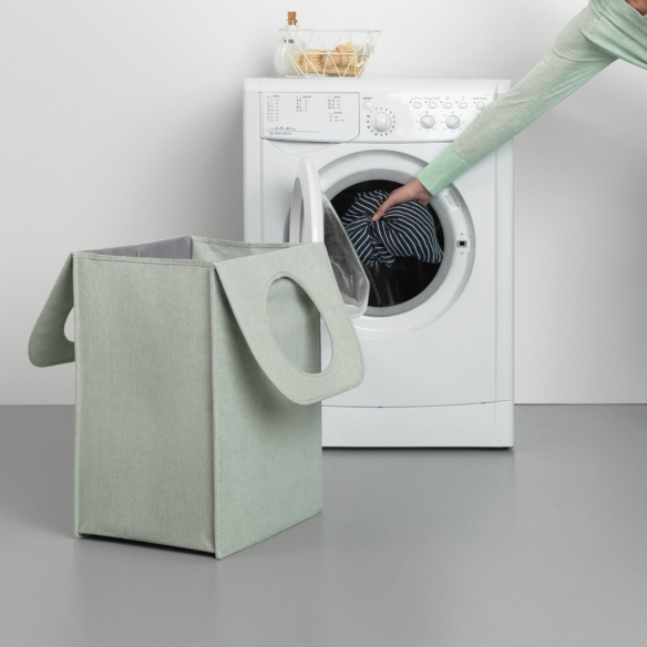Portabiancheria rettangolare realizzato in tessuto. È il salvaspazio perfetto, ma è anche molto capiente per portare un carico di biancheria, con una capacità da 55 litri. È ottimo per separare la biancheria ed è facile da riempire e svuotare, grazie all’apertura davanti e nella parte superiore. La grande apertura serve ad inserire il bucato e i grandi manici permettono di spostarlo facilmente. Disegnata e prodotta da Brabantia.