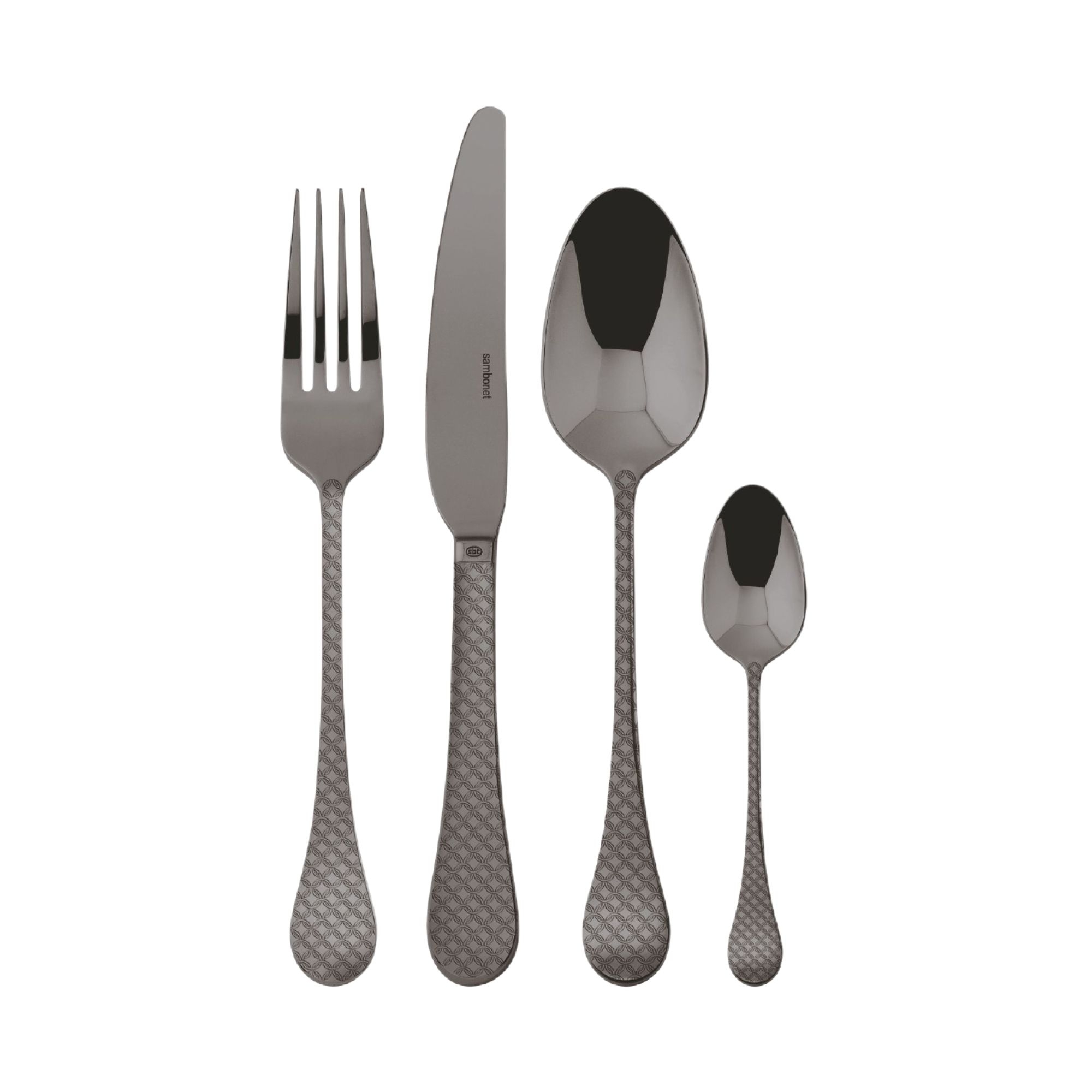 Servizio di 24 posate della nuova collezione Taormina, realizzato in acciaio inossidabile 18/10, rivestimento in PVD. Disponibile in 4 speciali finiture, il servizio di 24 posate Taormina comprende: