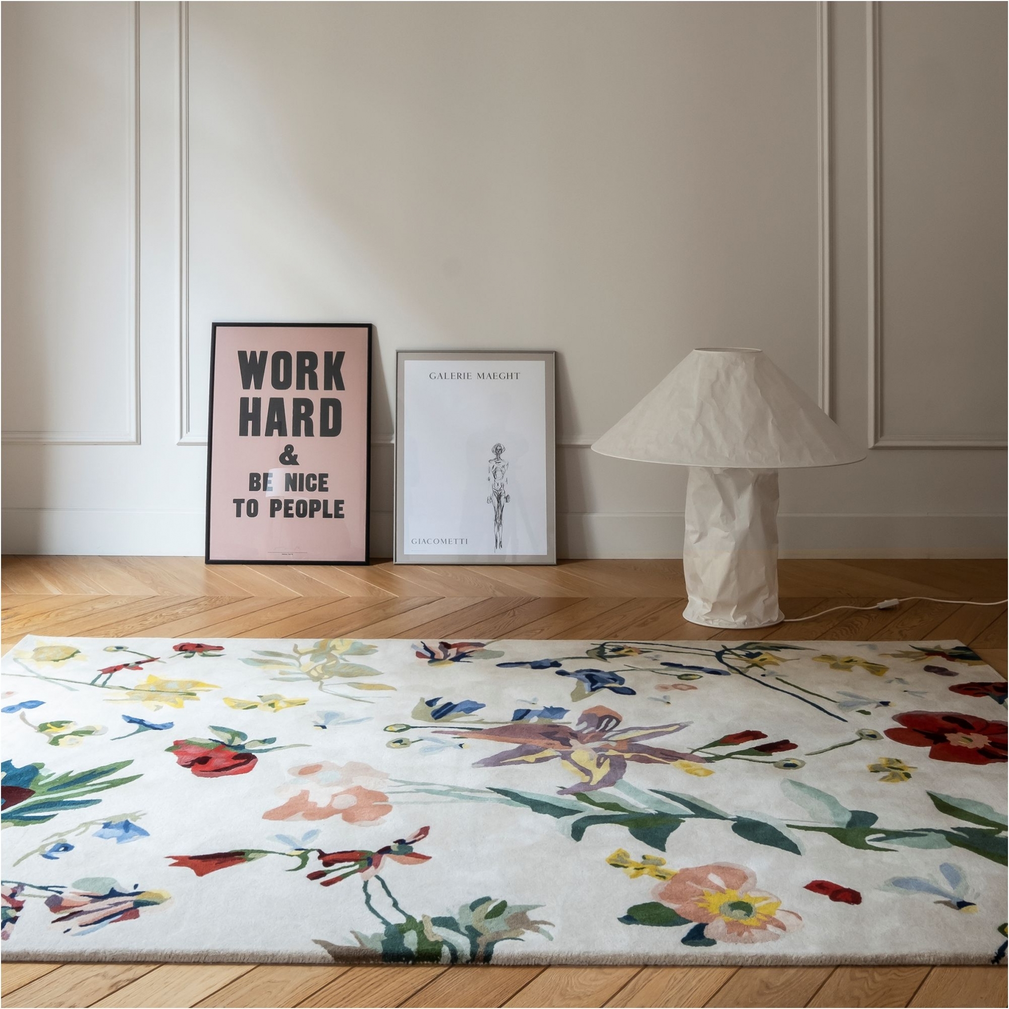 Tappeto Flora realizzato in lana vergine. Il tappeto Flora è disponibile in tre versioni: Promenade, che pullula di fiori dai colori vivaci, e Backyard, che rappresenta i fiori di campo che si trovano comunemente nel giardino di una casa. L'ultimo modello, Bloom, è disponibile in due versioni che catturano momenti diversi nella vita di un fiore: avvizzimento e fioritura. Flora è altamente estetico e d’impatto. Disegnato da Santi Moix per Nanimarquina.