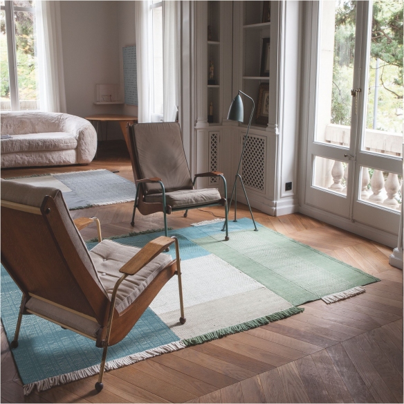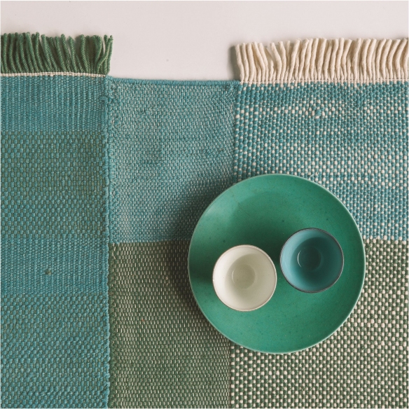 Tappeto Tres realizzato in lana della Nuova Zelanda e feltro. Il tappeto Tres è formato da tre strisce di colore che vengono cucite insieme. Inoltre, le varianti di colore sono varie, dal nero al blu, dal color salvia all’ocra, dal turchese al perla. La tecnica utilizzata è quella Dhurrie e le tradizioni indiane e giapponesi entrano in contatto per creare questo meraviglioso tappeto. Disegnato da Nani Marquina.