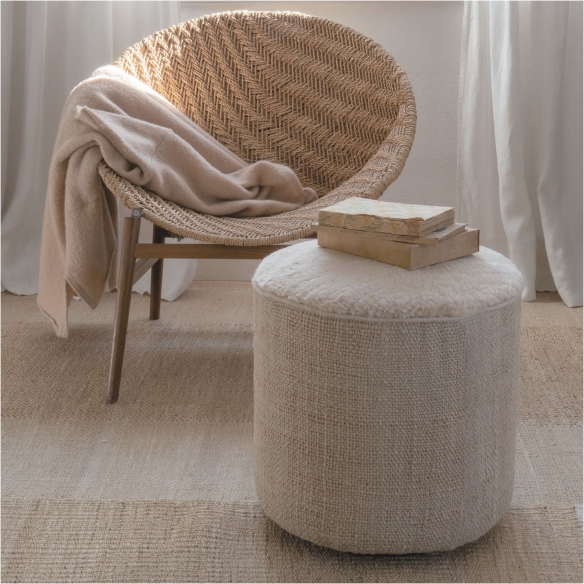 Puof Tres Persian in lana della Nuova Zelanda. Disponibile in due versioni, il pouf Vegetal è realizzato in 50% iuta e 50% lana della Nuova Zelanda mentre quello Black è per metà in cotone. Per entrambi i modelli si utilizzano gli stessi tessuti destinati ai tappeti appartenenti alle linee Tres e Persian. La seduta del pouf è morbida e confortevole, la fibra è piacevole al tatto, e la sua morbidezza ricorda la stessa sensazione di quando si appoggiano i piedi su un tappeto morbido, garantendo comfort e benessere. Disegnato da Elisa Padrón & Marcos Catalán per nanimarquina.