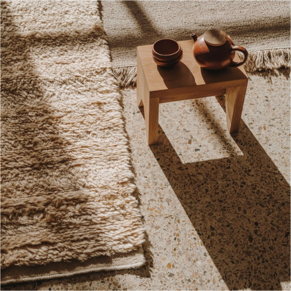 Il tappeto Wellbeing realizzato in lana Afghana (nella colorazione chobi), in iuta e ortica (nella colorazione ortica). I criteri stabiliti per la collezione includevano fibre naturali, sostenibili e locali, filate a mano, senza candeggina e senza coloranti. Questi requisiti impongono al team di nanimarquina di iniziare un profondo processo di indagine e iniziare a lavorare con un'ampia varietà di materiali, portando a un risultato consapevole, umano-centrico, sensoriale e bello. Tutte le innovazioni applicate hanno significato un passo avanti nel corpo di conoscenze di nanimarquina nella produzione di tappeti. La tecnica utilizzata è la tecnica dhurrie. Disegnato da Ilse Crawford per nanimarquina.