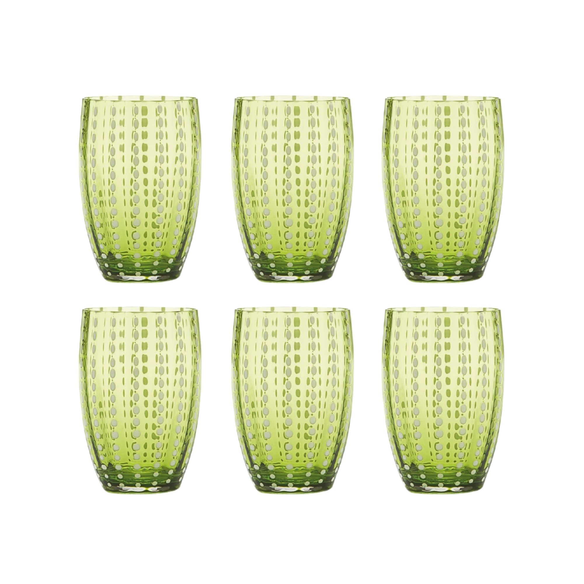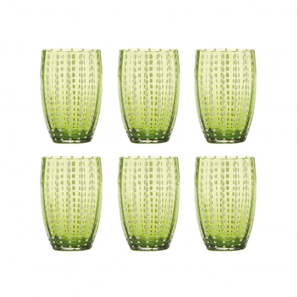 6 bicchieri dalla capacità di 32 cl, appartenente alla collezione Perle, realizzati in vetro borosilicato lavorato a mano. Disponibili in 14 eleganti e versatili finiture di colore, i bicchieri Perle si contraddistinguono per l'esclusivo design e per i materiali di altissima qualità. Le perle sono presenti su tutta la superficie del bicchiere e conferiscono ulteriore eleganza e raffinatezza. I bicchieri perfetti per aggiungere un tocco di vivacità alla tavola! Disegnati da Federico De Majo per Zafferano.