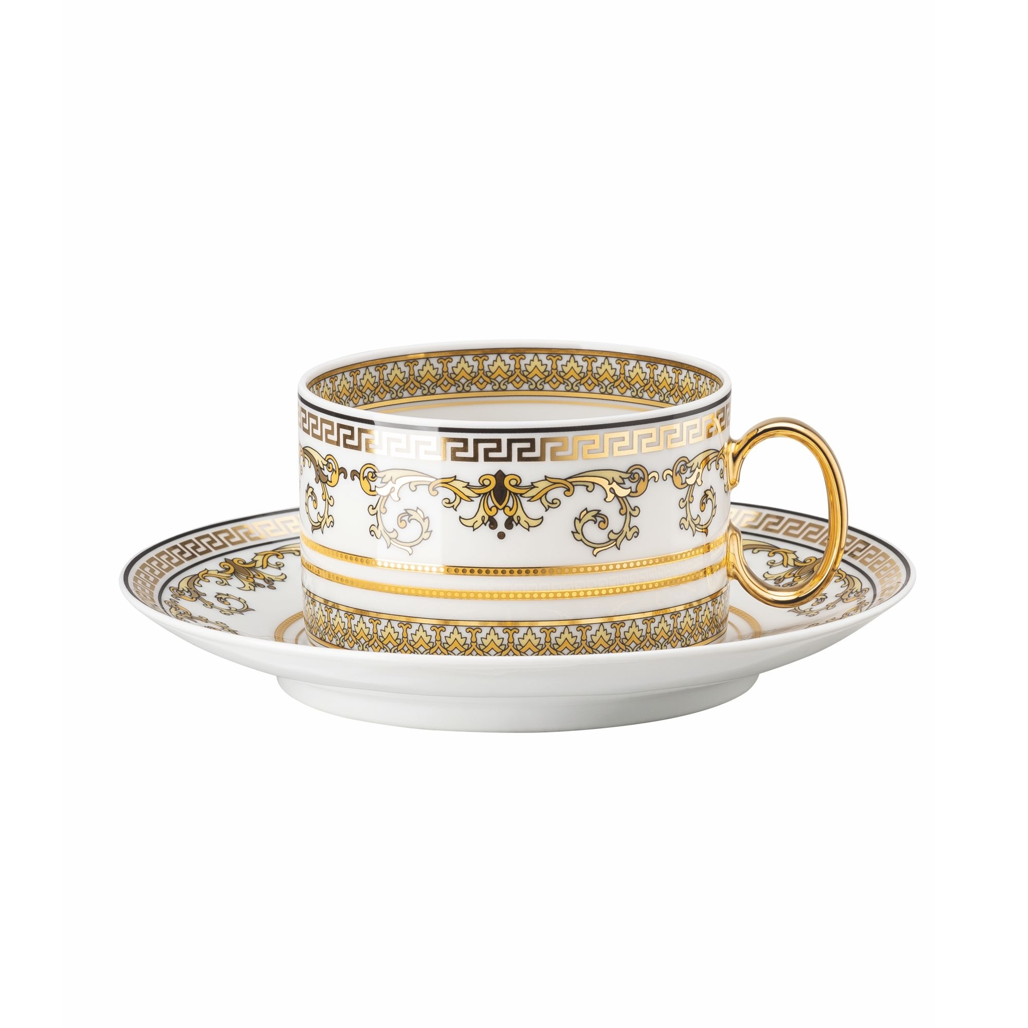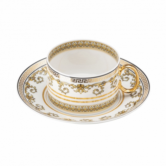 Tazza da tè comprensiva di piattino, appartenente alla collezione Virtus Gala, realizzata in finissima porcellana decorata. Raffinata ed elegante, la tazza da tè Virtus Gala ha una capacità di 20 cl, ed è perfetta per godere al massimo e con stile del rituale del tè. È disponibile in un brillante colore bianco, e presenta un prezioso motivo oro in stile Versace, che avvalora ancora di più la tazza ed il piattino. Realizzata da Versace Rosenthal.