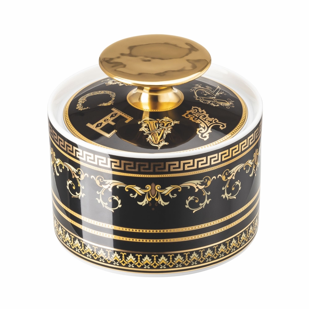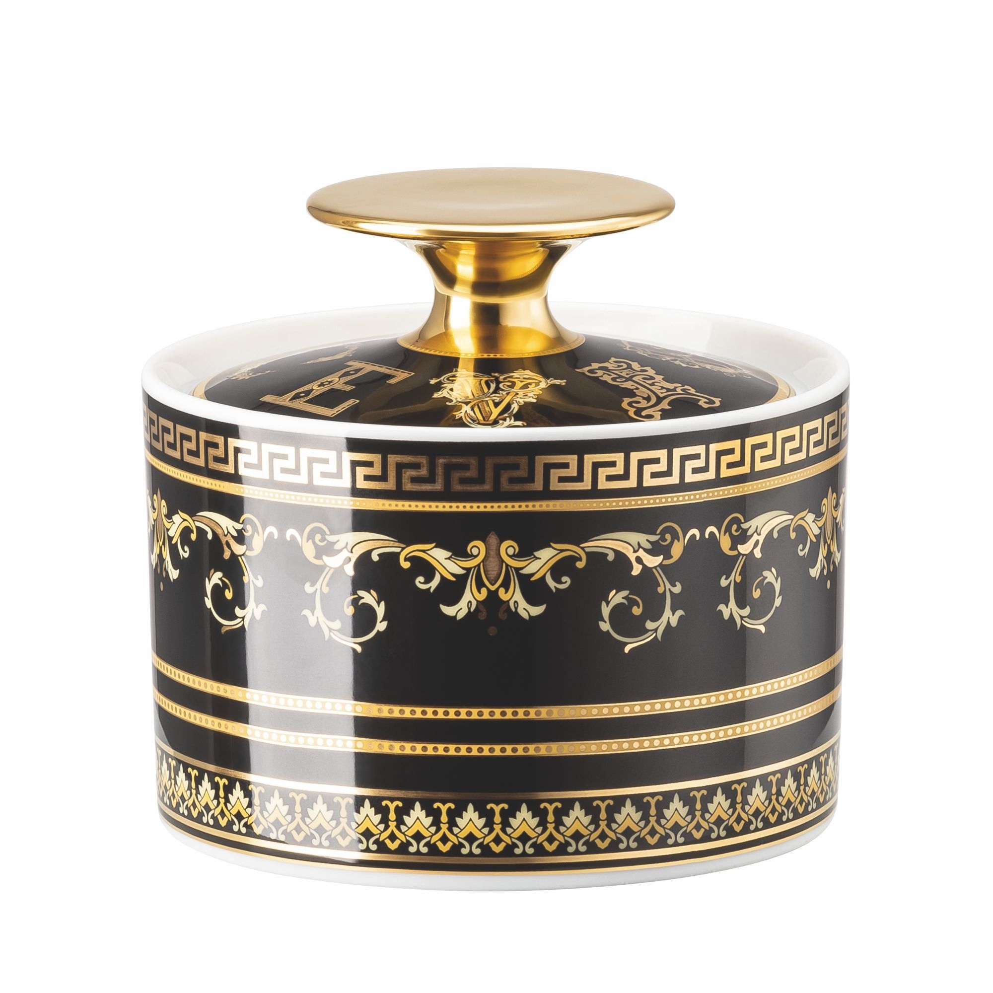 Zuccheriera appartenente alla collezione Virtus Gala, realizzata in finissima porcellana decorata con motivi oro su fondo nero. Accessorio elegante per la tavola, la zuccheriera Virtus Gala è impreziosita da un coperchio dorato, riportante il logo "Versace" in grado di mettere in risalto l'intero oggetto. L'accessorio perfetto per addolcire i tuoi momenti di pausa con l'iconico stile Versace! Realizzata da Versace Rosenthal.