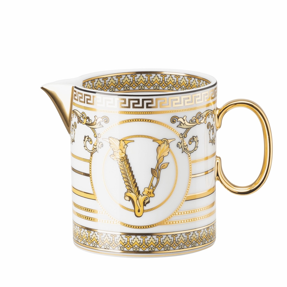 Lattiera da 18 cl, appartenente alla collezione Virtus Gala, realizzata in finissima porcellana decorata. Caratterizzata dai classici motivi dello stile Versace, con la "Medusa" e la "V" applicate sulle facce contrapposte, la lattiera Virtus Gala è l'accessorio perfetto per godere al massimo e con stile i vostri momenti di pausa té o caffè. Il design esclusivo la rende anche un complemento d'arredo di spicco, perfetto per coloro che vogliono donare un'identità forte alla propria collezione di stoviglie. Realizzata da Versace Rosenthal.